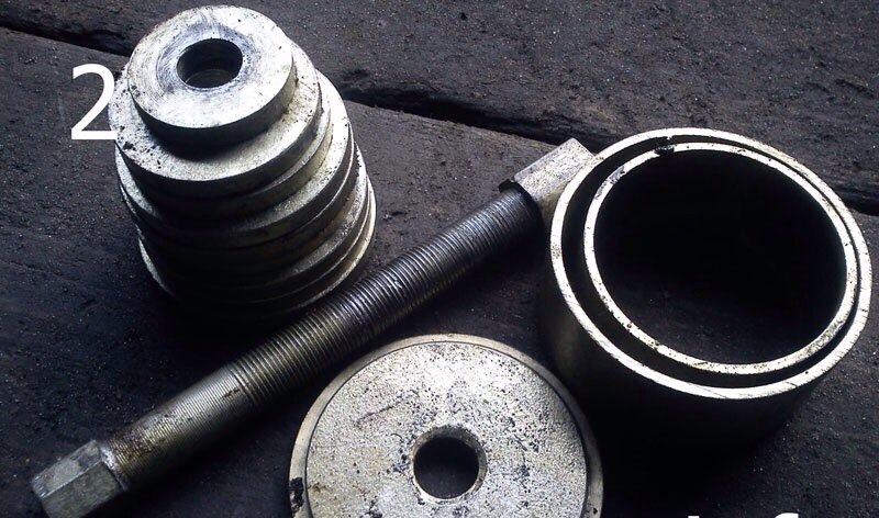 Инструмент для замены подшипника передней ступицы на автомобиле Чери Кимо, Chery Kimo: молоток, кусок трубы (с наружным диаметром 35-38 мм), пассатижи для снятия стопорных колец, зубило (может пригодиться), крепкий ключ на "30" (смотрим фото 3), шестигранник на 5, накидные и торцовые ключи на 10, 13, 15, 18, 19, монтировка или большая отвертка, съёмник для рулевых тяг (фото 1), тиски, две дополнительные руки будут тоже кстати (читаем трезвый помощник). И главное — приспособление для запрессовки и выпрессовки подшипника.От простого набора для работы с подшипником передней или задней ступицы, он отличается наличием большого количества шайб (10 штук) и двух колец, разного диаметра. Его я и использовал для в этой работе (фото 2). Разница в цене этих приспособлений небольшая и если Вы не собираетесь ограничиваться заменой подшипников только на любимом Кимо, то Вам универсальный набор, точно пригодится. Решать Вам. Единственное, я подобрал другое кольцо, с более толстым бортом (7 мм) и внутренним диаметром 75 мм. И ступица на него лучше легла, да доверия у меня к нему больше))).