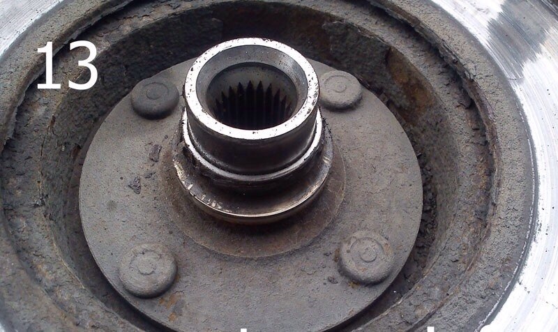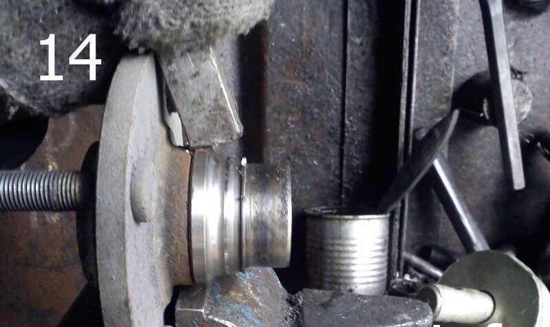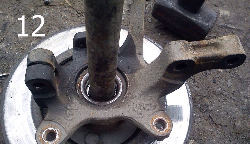 5. Вспоминаем о помощнике. Один держит поворотный кулак в таком положении, как на фотографии 12, второй выбивает ступицу. Тормозной диск лучше сразу снять. Ступица обычно вылетает вместе с внутренней обоймой подшипника (фото 13). Я обычно сбиваю эту обойму тупым зубилом (фото 14 и 15). Внимание, от обоймы могут лететь осколки! Эти действия производите в защитных очках и проконтролируйте, чтобы рядом никого не было.