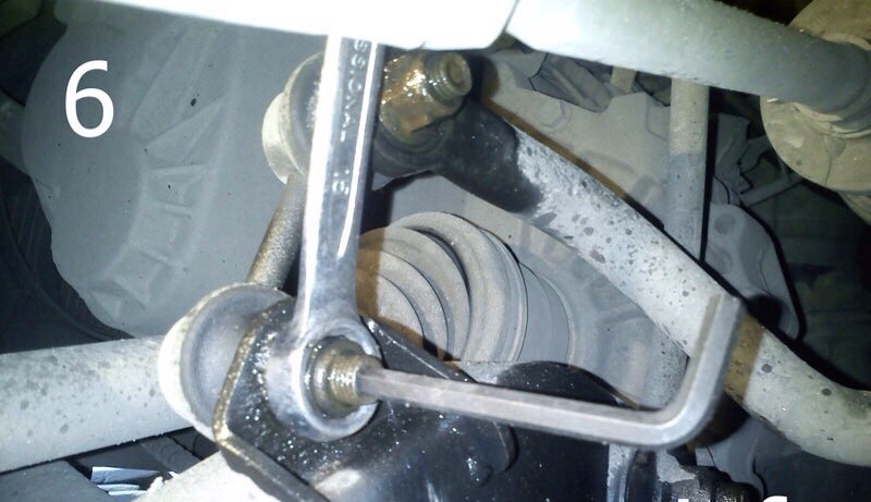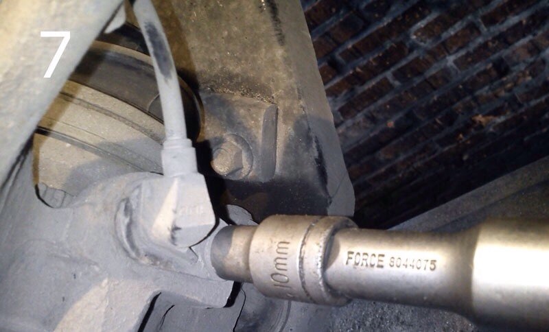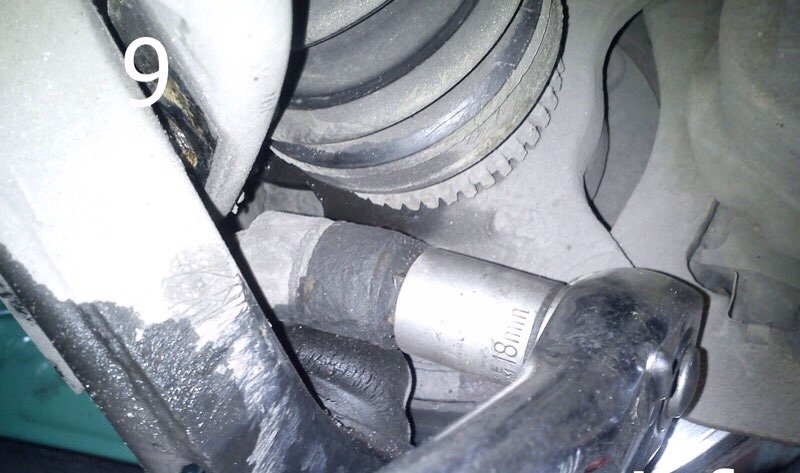 2. Далее, откручиваем гайку стойки стабилизатора (фото 6). Ключом на 10 откручиваем болт датчика АБС и отверткой, аккуратно подталкиваем датчик от ШРУСа (фото 7 и 8), вынимаем его.