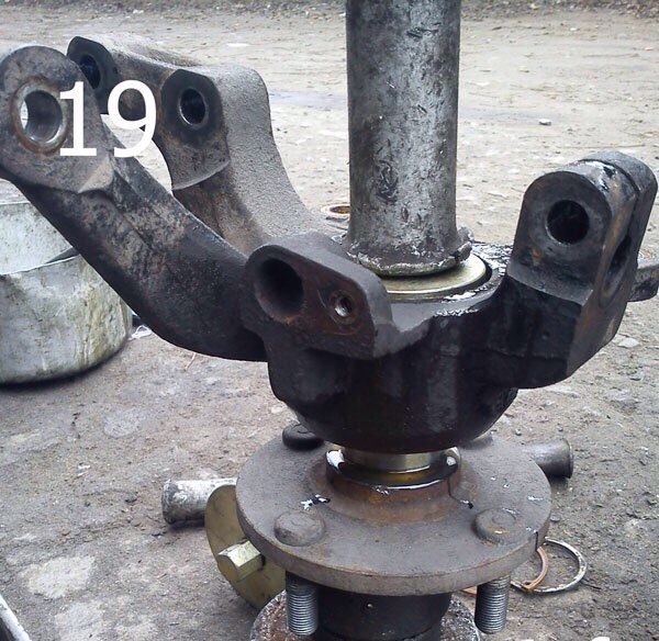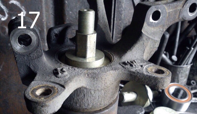 7. Сооружаем примерно такую конструкцию как на фотографии 19. И набиваем подшипник на ступицу. Главное в этом процессе, усилие следует прикладывать к внутренней обойме подшипника.