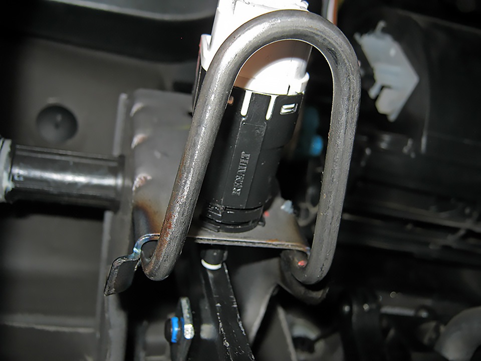 Оно держится на педали само и все, что требуется далее — просто вставить датчик обратно — регулировка произойдет в момент поворота. Снимаем приспособление с педали и проверяем.