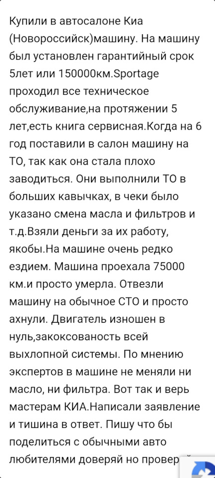 Инженером по гарантии *********, в замене деталей(амортизаторов и отбойников амортизаторов) мне было отказано, ссылаясь на внутренние документы\инструкции от "Киа Моторс Рус" и то, что текущие и стучащие амортизаторы не влияют на безопасность автомобиля; текущее из двигателя масло через сальниковое уплотнение не является поломкой(ссылаясь на страницу 8 Сервисной книги), если не происходит расхода масла, проверка же расхода масла посредством опломбировки маслозаливной горловины и сливной пробки не производилась, как и иными способами.