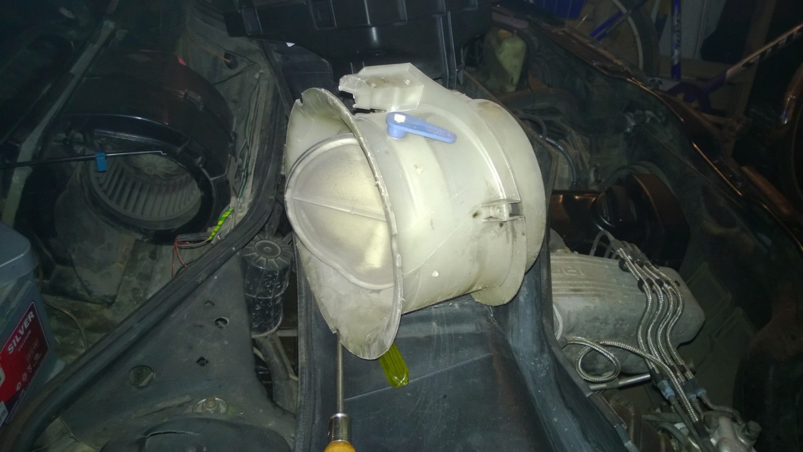 Как только забрал фильтр, полез под капот его ставить. Тут надо отметить, что в зависимости от комплектации, на сотках к печке крепятся разные пластиковые корпуса. Я насчитал как минимум четыре: с прямоугольным фильтром, с круглым фильтром, с грубым фильтром-сеточкой, вообще без фильтра. У меня был вариант "вообще без фильтра".
