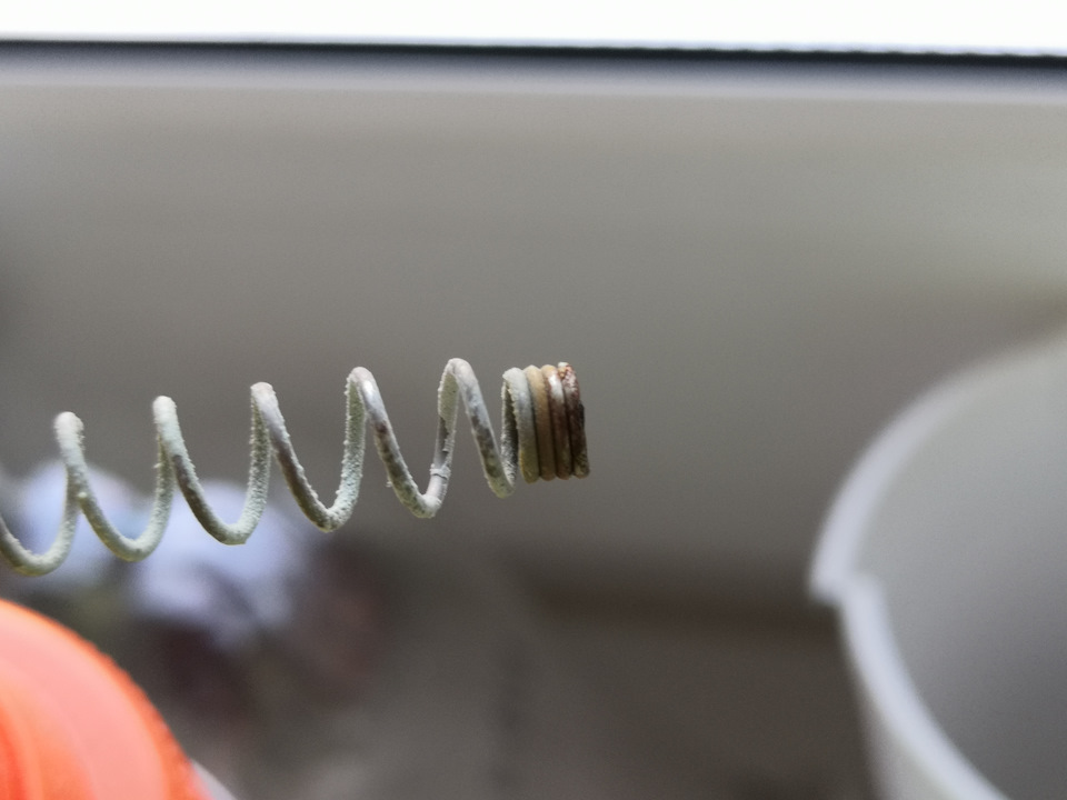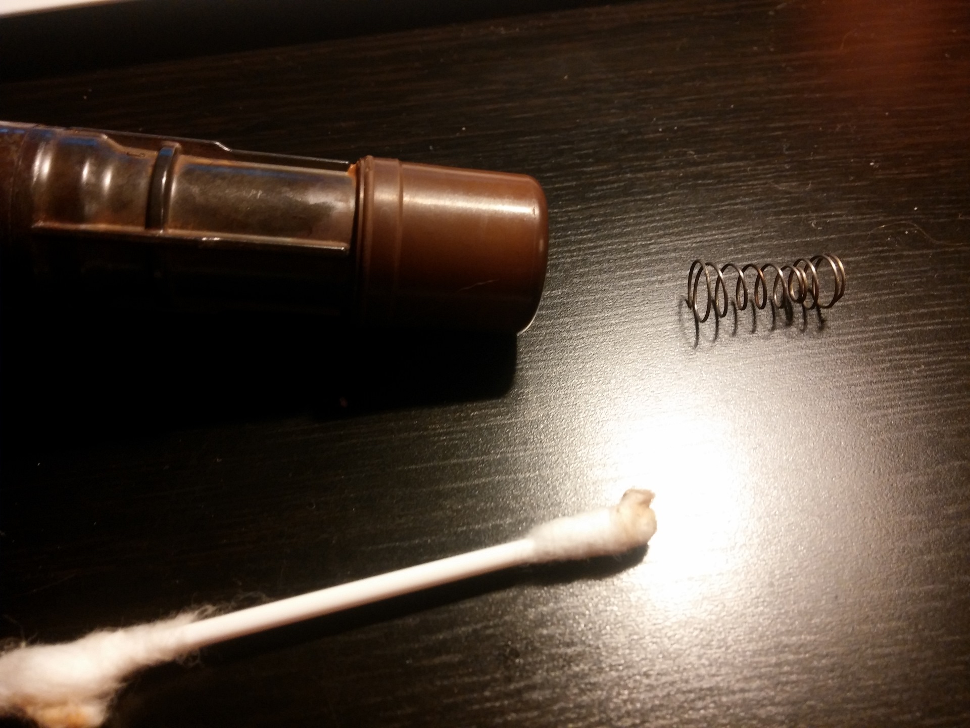Загнутой скрепкой вытаскиваю пружинку (она сидит в посадочном гнезде как-бы под конус), чистим внутри и саму пружинку от ржавчины, я использовал преобразователь ржавчины (Дядя Гарри подсказал), но он не везде отчищает — отвертка в помощь, сушим