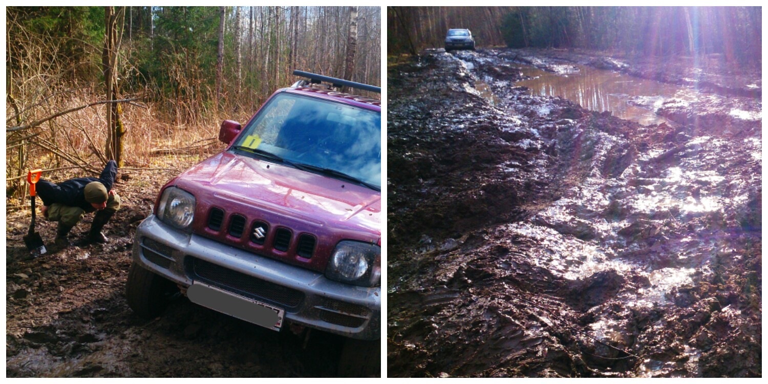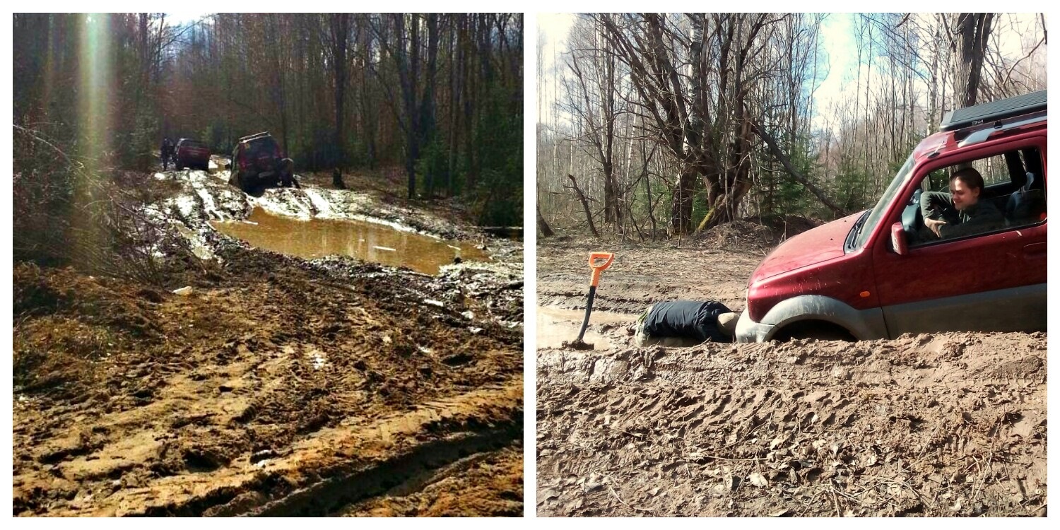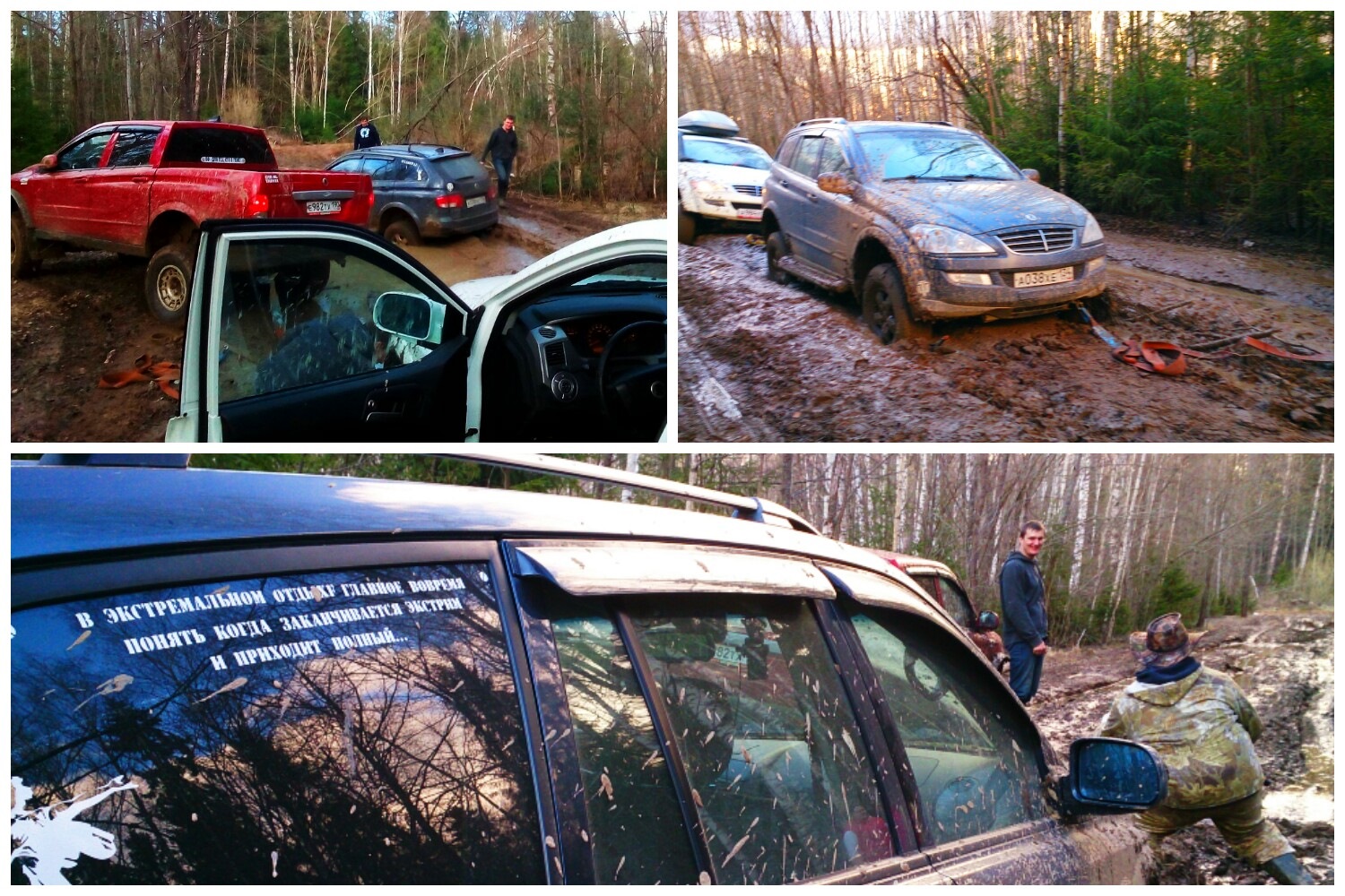 Сперва при попытке развернуться, я свалилась в колею. Миша подкопал, мы проехали метров 50, колея стала еще глубже и снова сели. Потом стали поочередно застревать сангйонги. Что у них происходило – мы не видели, т.к. я продолжала упорно крутить руль не в ту сторону и мы были очень заняты раскопками.