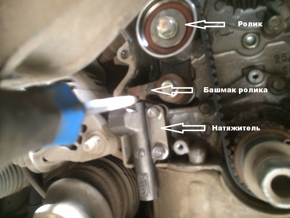 Натяжитель давит на башмак привода ролика, а ролик уже натягивает ремень. Между ними я вставил макро-отвертку (зазор смотрел) и чека там еще на месте.