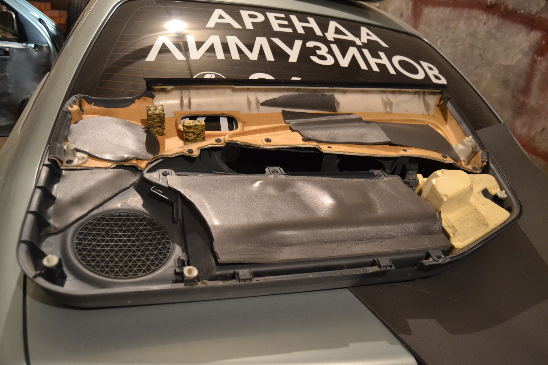 и сплен, помойму 190 руб. за лист. На следующий день встал пораньше, что бы в 8 утра быть в гараже. Приехал в гараж, и начал разбирать водительскую дверь. Разбирается она довольно легко. Открываете двери, снизу есть саморез — его выкручиваете, вытаскиваете маленькую клепку, которая похожа на саморез, в правом верхнем углу. Потом снимаете каемку у открывашки двери, выщелкиваете подлокотник и блок управления стеклоподъемниками (не забываем отстегнуть фишку), откручиваем два болта в местах, где был подлокотник и вытаскиваете маленькую клепку, которая похожа на саморез. Далее приподнимаем карту вверх и выщелкиваем из клепок. Вот что спрятано под дверной картой.