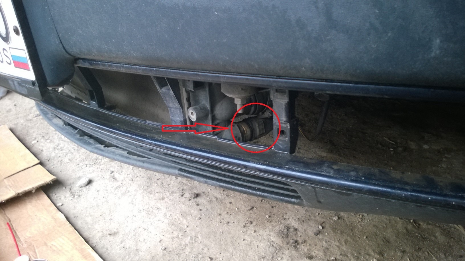 Кстати, вытащив решетки из бампера, увидел температурный датчик вентилятора. Год назад я менял его, тянувшись руками сверху, почти наощупь. Оказывается, к нему можно было подобраться проще, через отверстия в бампере.