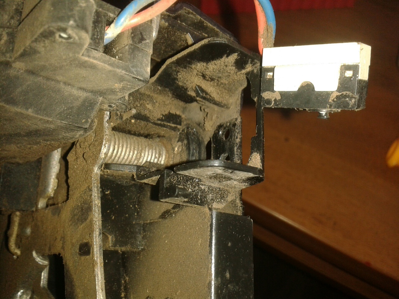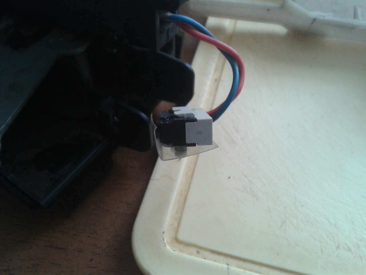 5. Отщелкиваем пружинную скобу на замке и вытаскиваем микропереключатель. Видим, что кнопка стерлась и проделала дорожку до металла на овале замка, который ее нажимает. Вырезаем из пластиковой 1,5 л. бутылки маленький прямоугольник, делаем на нем две дырки, подрезаем по размеру. Около кнопки делаем неширокий лепесток, через который овал будет давить на кнопку. Проверяем работу микропереключателя, закрывая замой отверткой, и, открывая его тросиком. Кнопочка должна щелкать при открытии и закрытии.