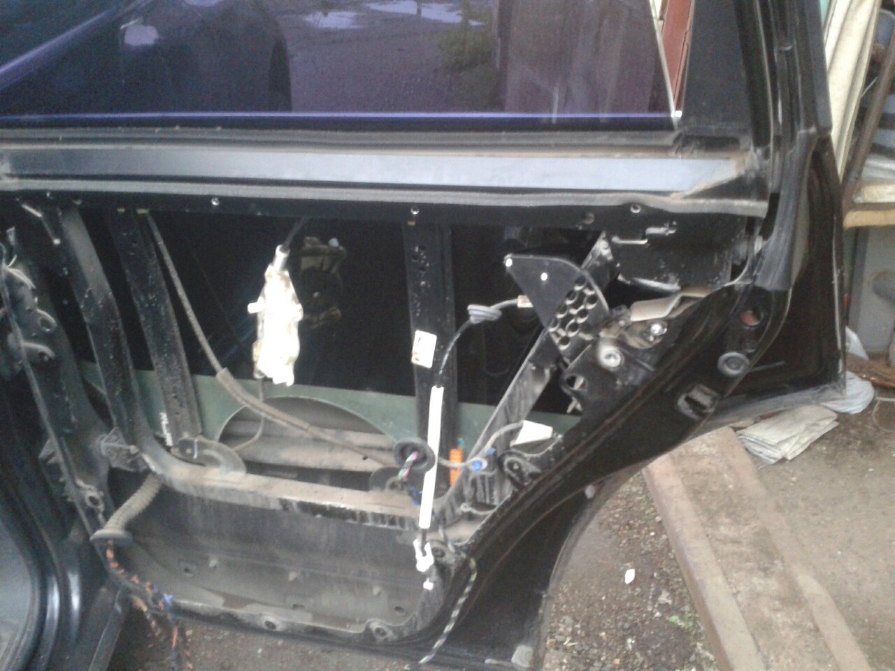 3. Снимаем две пластиковые заглушки с двух сторон двери и откручиваем по два больших болта с двух сторон. Они держат противоударную прямоугольную конструкцию, к которой прикреплен механизм поднятия стекла. Вынимаем вверх, а потом влево эту конструкцию вместе со стеклом. Одновременно, вытаскивая тросик открытия двери и отгибая пластик замка.