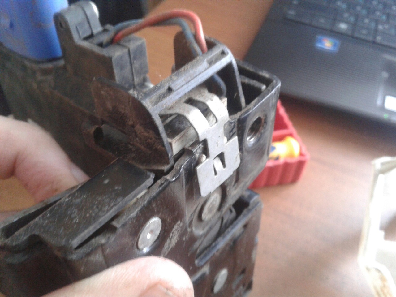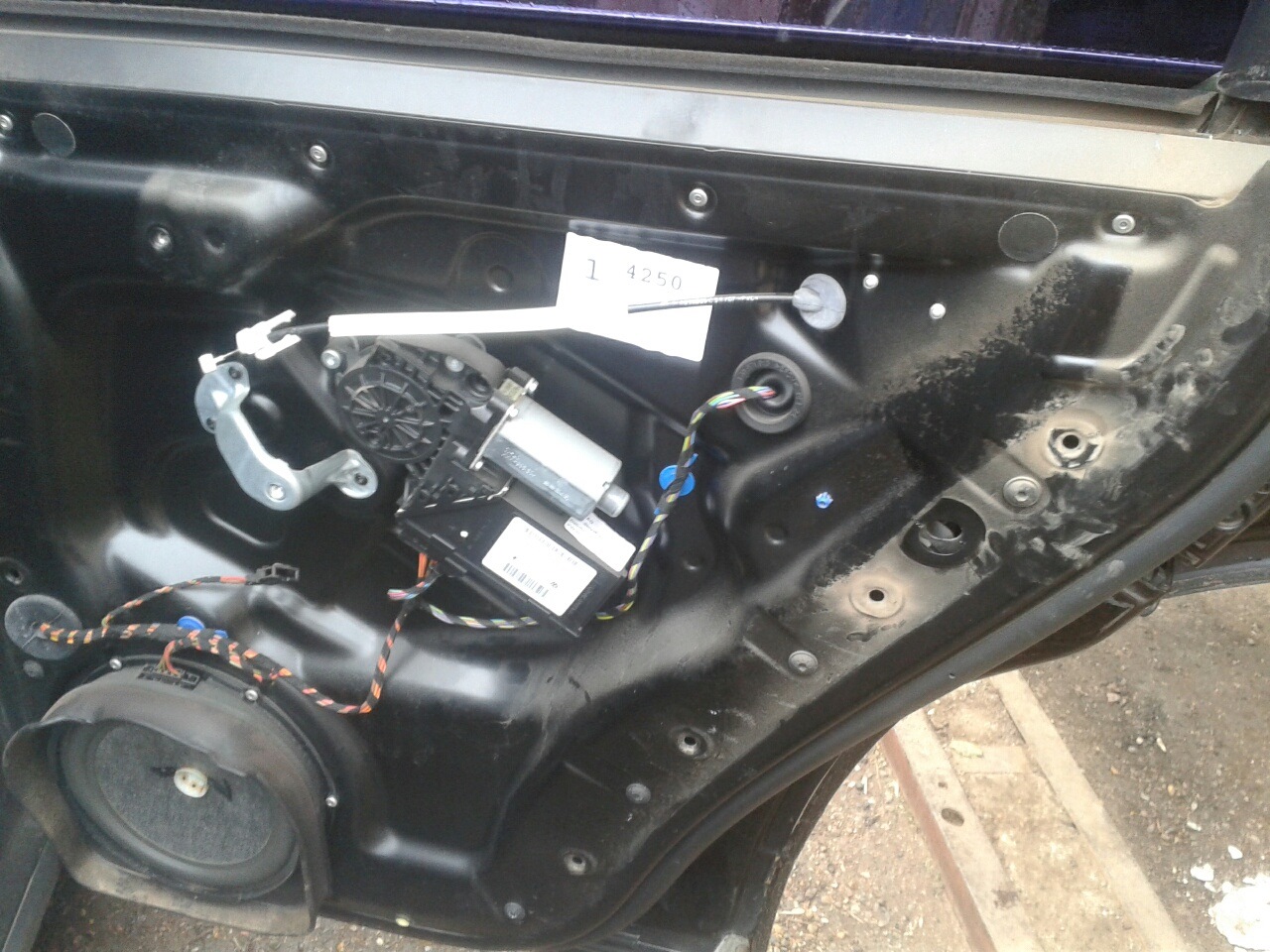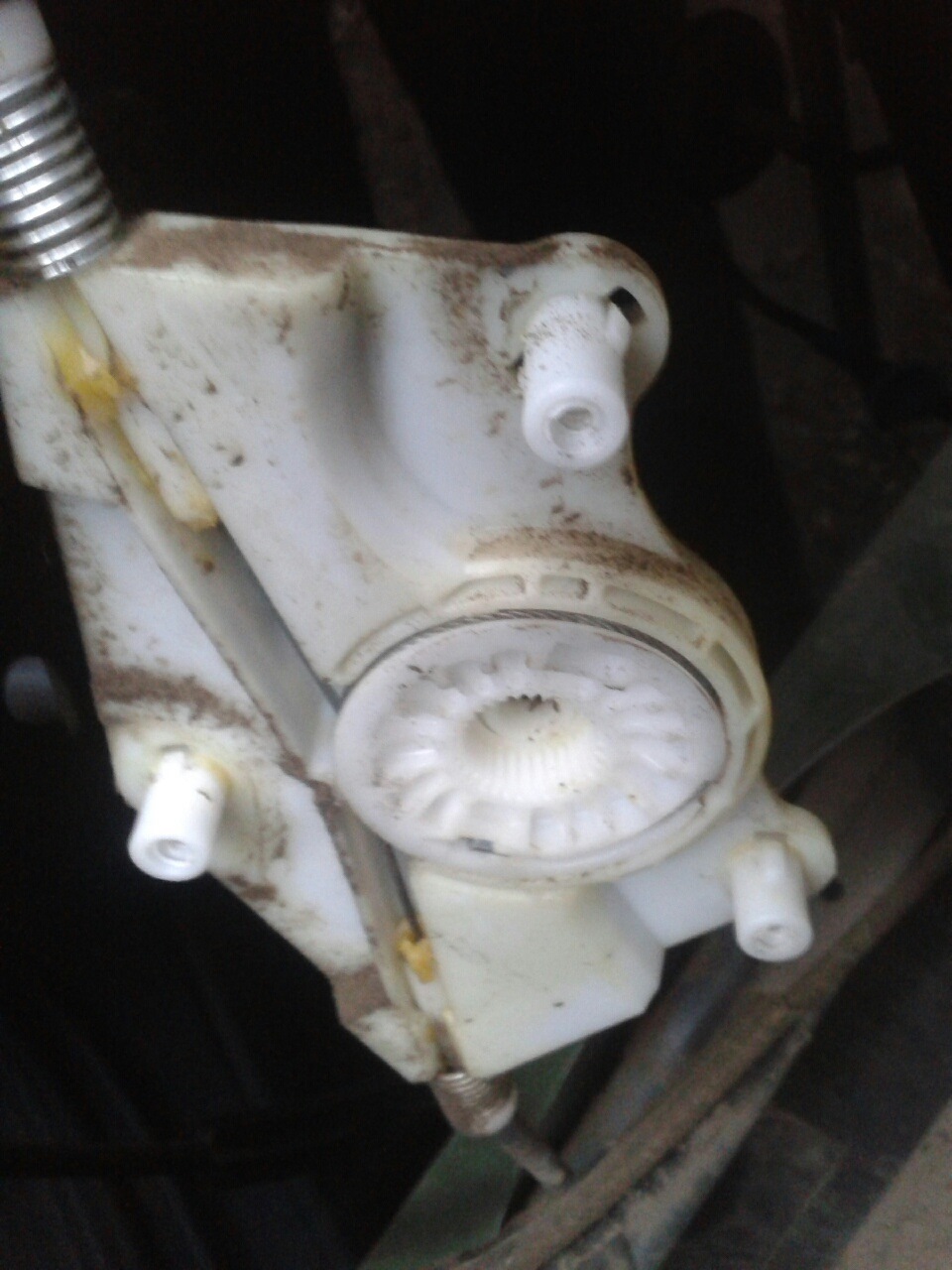 Перегородка будет болтаться. Откручиваем мотор стеклоподъемника и аккуратно его разъединяем от второй части, где намотан тросик. Важно при разъединении длинной отверткой поддерживать пластиковую шайбу, которая на обратной стороне держит намотанный тросик и не дает ему вылезти. Если не поддержать, то трос слезет и придется его наматывать.