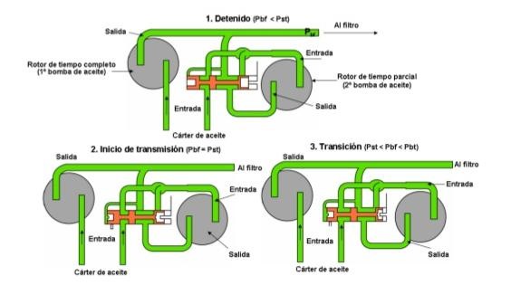 Pst <pbf <pbt: Первый насос подает масло в двигатель непрерывно выход 100% в то время как второй насос постепенно уменьшает подачу.