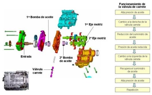 Конструкция и принцип действия BSM (модуля балансировочных валов), который крепится к блоку двигателя и находится в масляном поддоне. Он снижает вибрацию двигателя противовесами, которые вращаются в противоположном направлении по отношению к направлению вращения двигателя, тем самым устраняя силы инерции. Тем самым уменьшается вибрация и шум в двигателе. Механизм включает в себя два масляных насоса. BSM и масляные насосы не требуют обслуживания. Цепь привода BSM имеет цветные ссылки для легкой установки и натяжки автоматическим натяжным устройством. Наличие двух масляных насосов обусловлено необходимостью обеспечения достаточного давления масла для работы CVVT на низких оборотах двигателя. Блок BSM, как показано на изображении, состоит из трех осей, пару передач, два масляных насосов, золотникового клапана и внутреннего контура маслоканалов. BSM компенсирует вторичную вибрацию двигателя с помощью противовесов на валах. Масляные насосы установлены на входном валу и втором валу блока балансиров, соответственно. Первый масляный насос (основной, постоянного действия) производит в 1,25 раза больше оборотов, чем количество оборотов двигателя, а второй насос (дополнительный, приводится в действие давлением масла) производит в 2 раза больше оборотов, чем количество оборотов двигателя. Второй насос выполняет дополнительную функцию, уменьшая уровень шума между осью проводников. Золотник (перепускной клапан) приводится в действие давлением масла из главной галереи. Принцип этой схемы состоит в поддержании достаточного давления масла для системы CVVT до 2000 оборотов. Первый или основной насос в основном создает давление моторного масла. Второй масляный насос обеспечивает подачу масла к CVVT до 2000 оборотов. При увеличении оборотов второй насос перестает создавать давление, потому что золотник(перепускной клапан) BSM изменяет внутреннюю геометрию циркуляции масла.