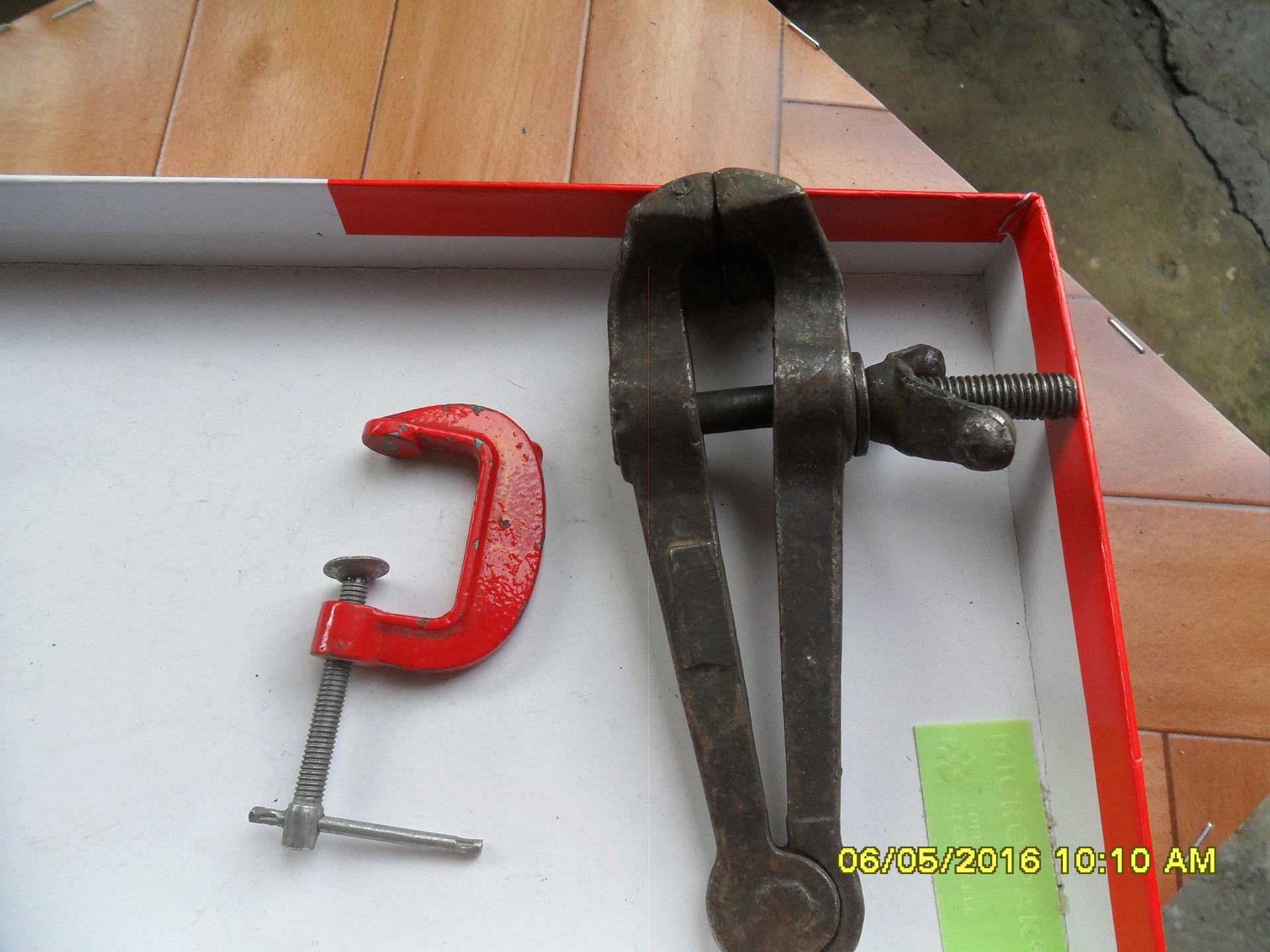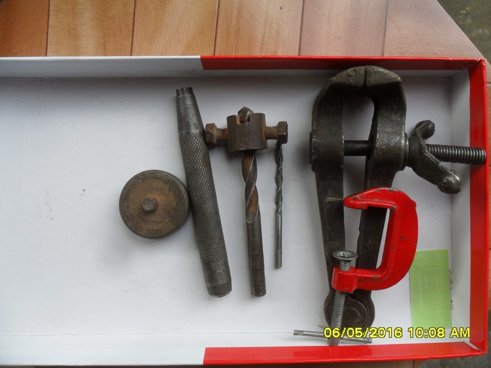 Собственно, вот они, сверло диаметром 4,2-4,5 мм, сверло 8,5 мм с ограничителем, поддержка, пуансон, струбцины.