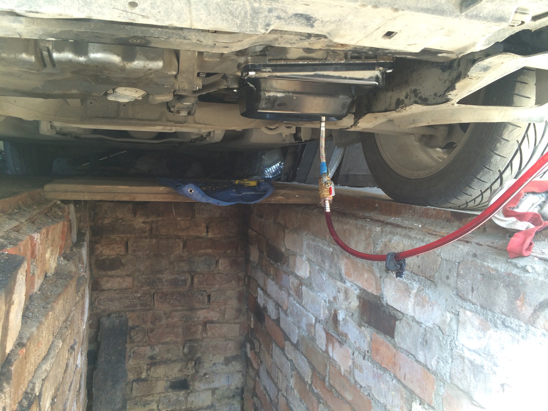 но этот способ не годится для сервиса — ибо там время — деньги, а тут минимум АКБ сними — залезь — болт открути — потом аккуратно нужно в лейку лить 4 литра — АКБ обратно ставь — это пипец!