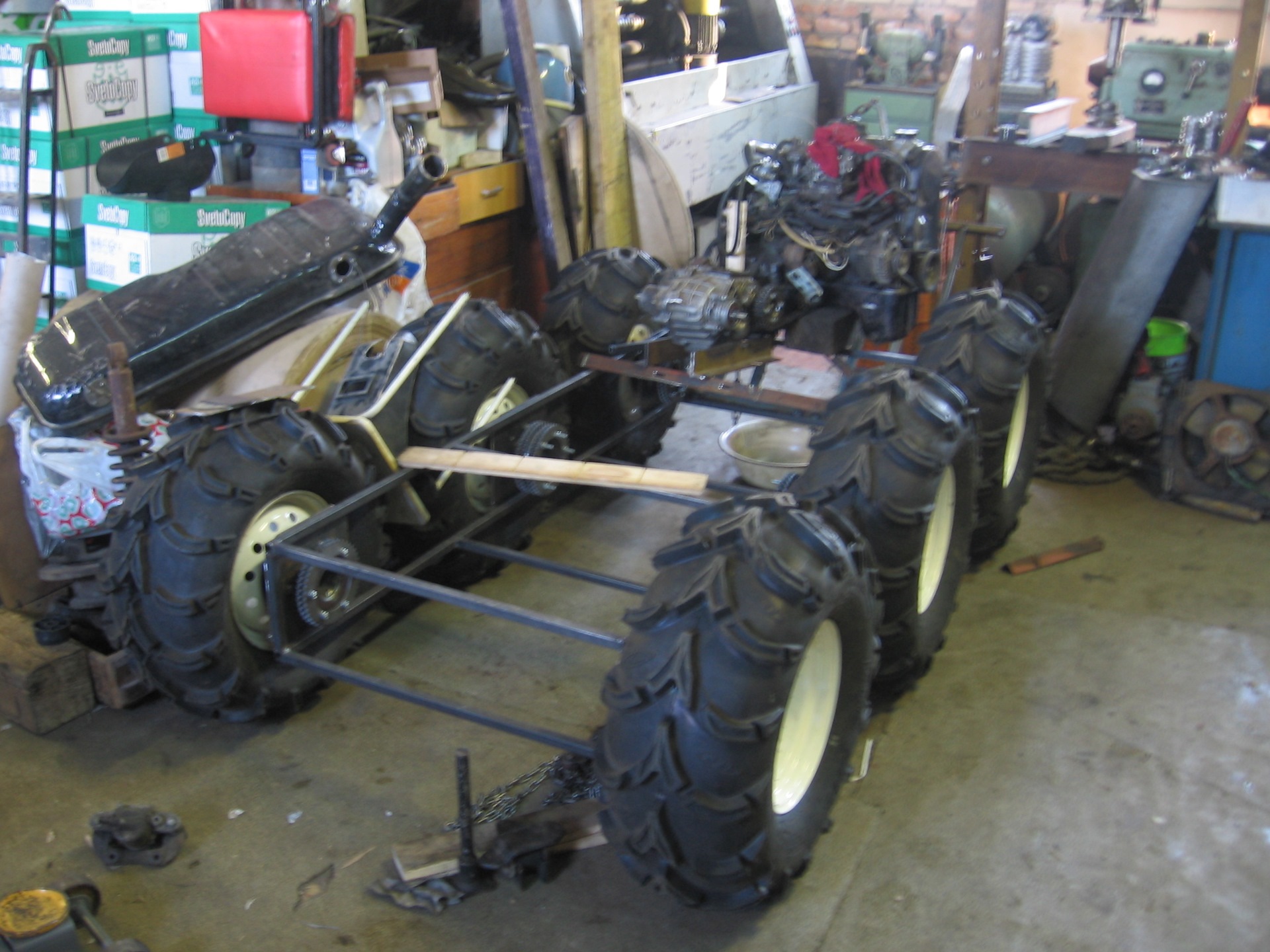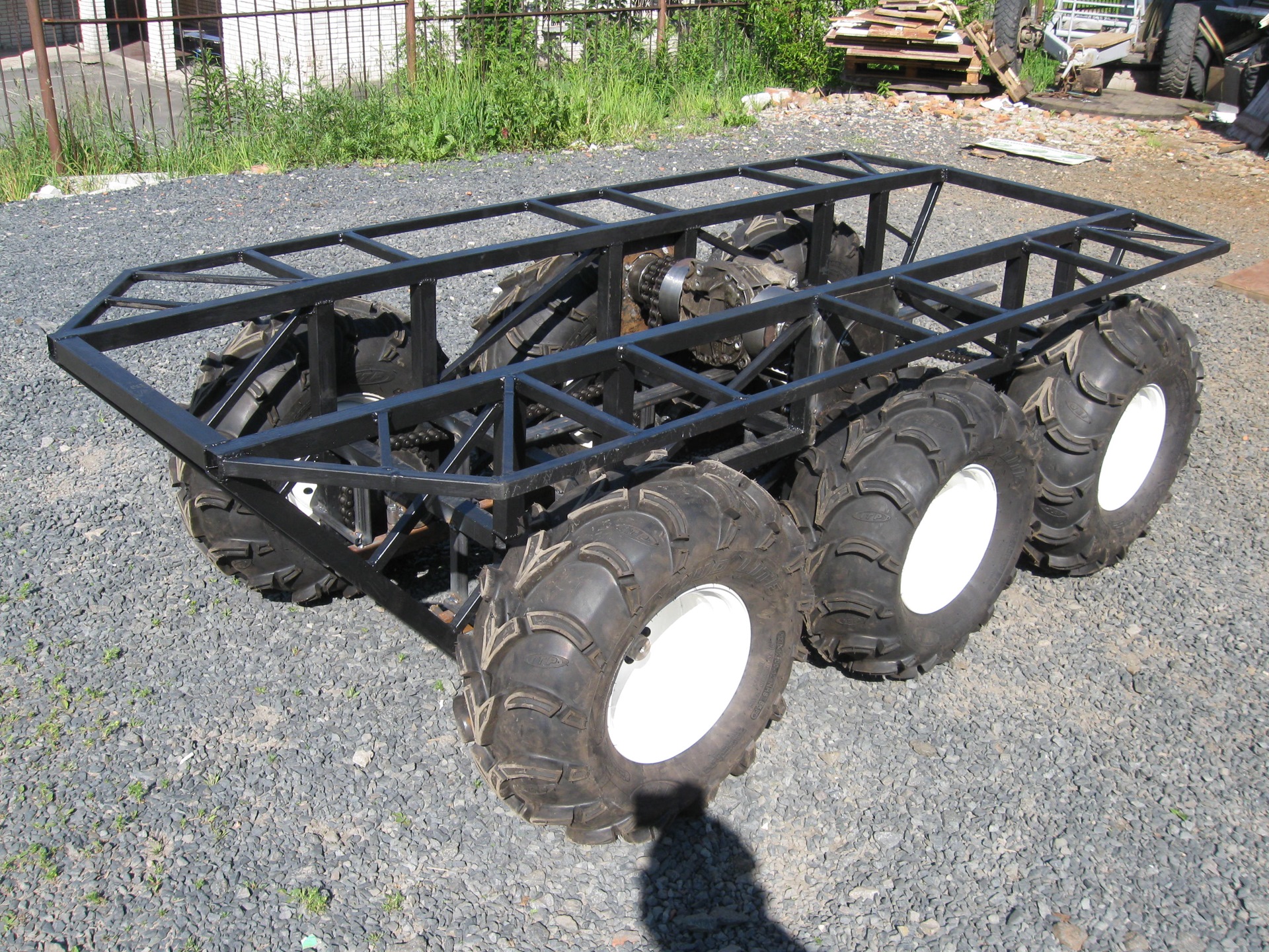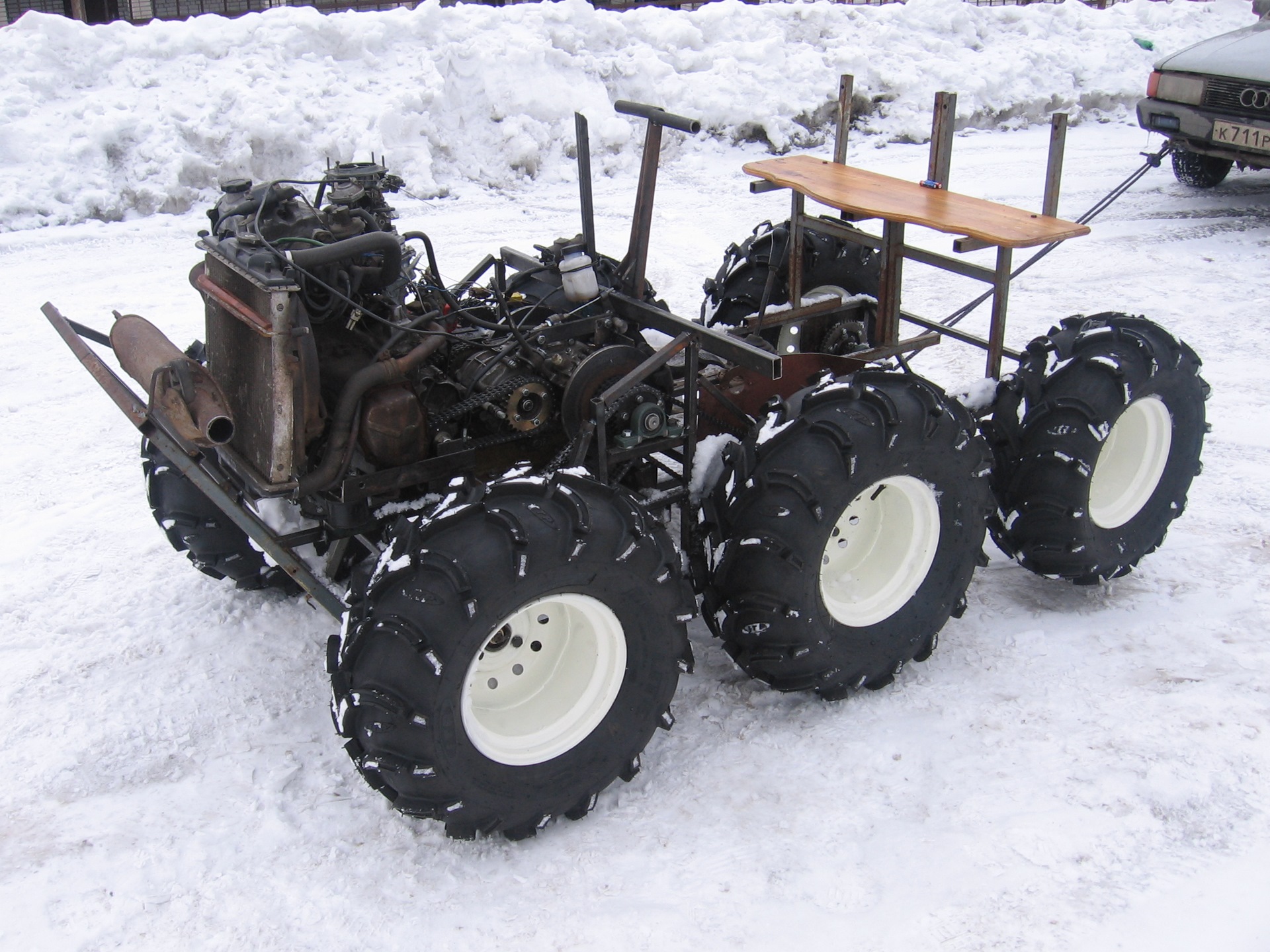 Концепция номер 1: двс поперек, цепная( шрус 17з ява) на раздадку нивы(на фланце 27 зубов), на выходных фланцах торм. диски, далее оси на два борта, там двойные звезды по 27 зубов( моторолер) от них на переднию и среднюю ось( там на 41 зуб-восход) от средней на заднию.Цепь использовали 2пр 12.7.