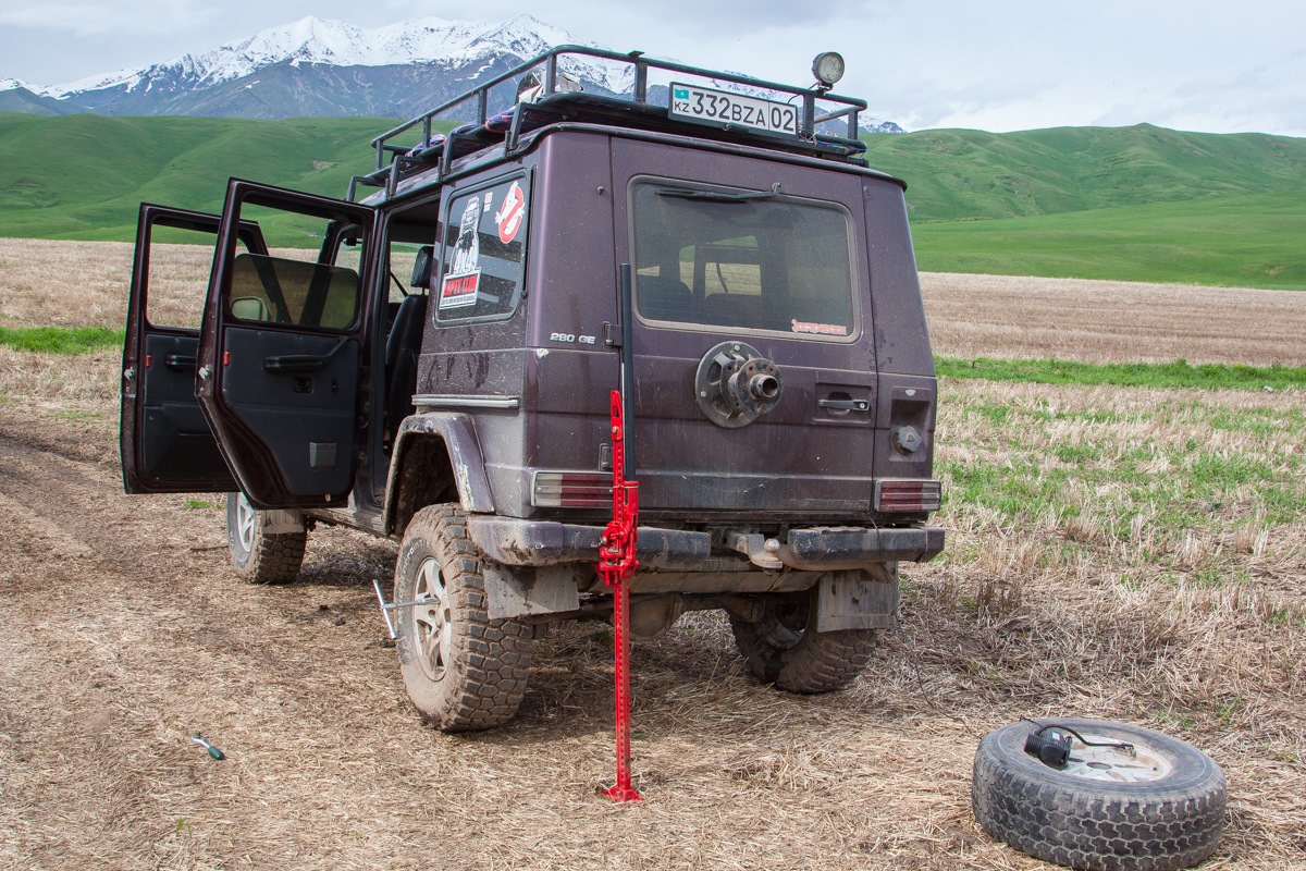 Уже по дороге домой в Сарыозеке ещё раз пробил тоже заднее колесо. в 1 ночи в шиномонтаже по трассе ремонтировали оба баллона. Грязные — чумазые и довольные приехали в город.