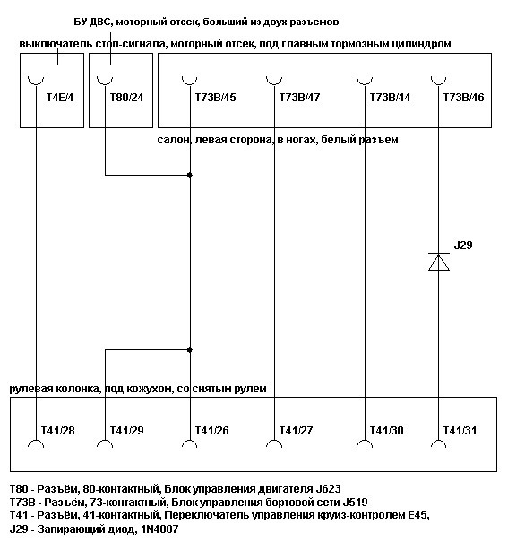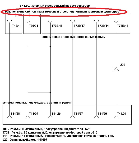 Многие приводят эту схему подключения. Автор у меня вопрос, почему на схеме 28 контакт от подрулевого идет на выключатель стоп-сигнала, а в описании на +12 в колодку предохранителей?