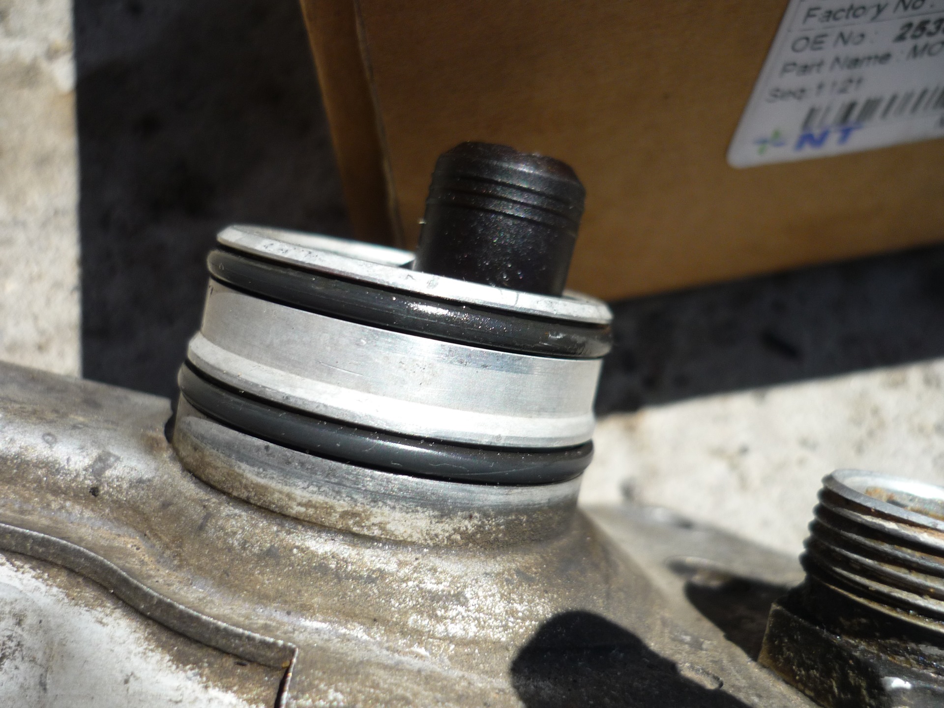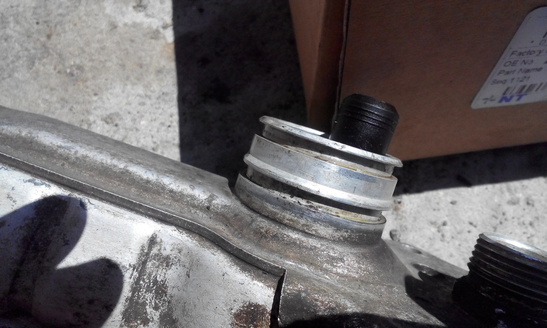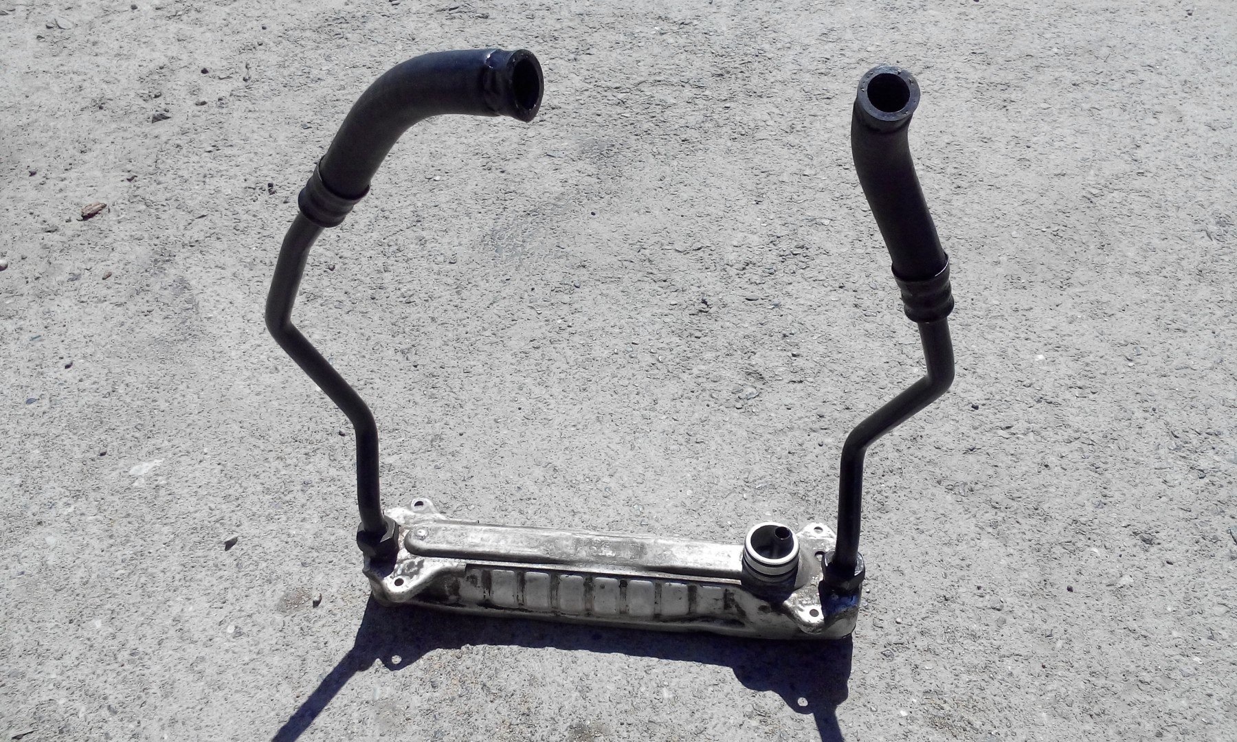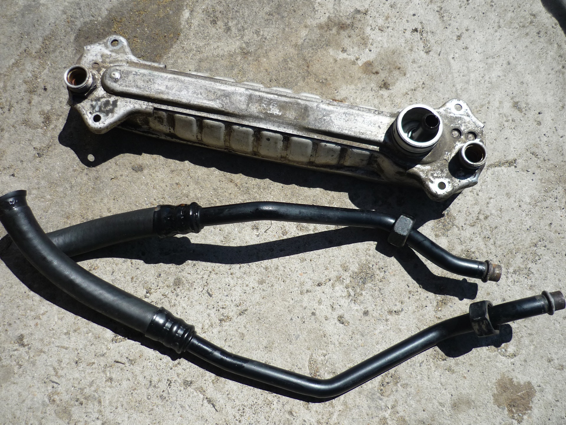 Всем привет. На более ранних моделях этой коробки теплообменник расположен снизу коробки передач. В Дальнейшем его вынесли вперед к радиатору, что способствовало улучшенному охлаждению масла. Мой гнилой донор не позволил снять нормально теплообменник… Прикипевшие гайки при откручивании подарили мне трещину в месте крепления резьбы на корпусе теплообменника… Не желая возиться с откручиванием и завариванием я решил просто купить другой. Взял у Саши Синего из Саратова, потому как не было уверенности, что мой не будет течь после ремонта…