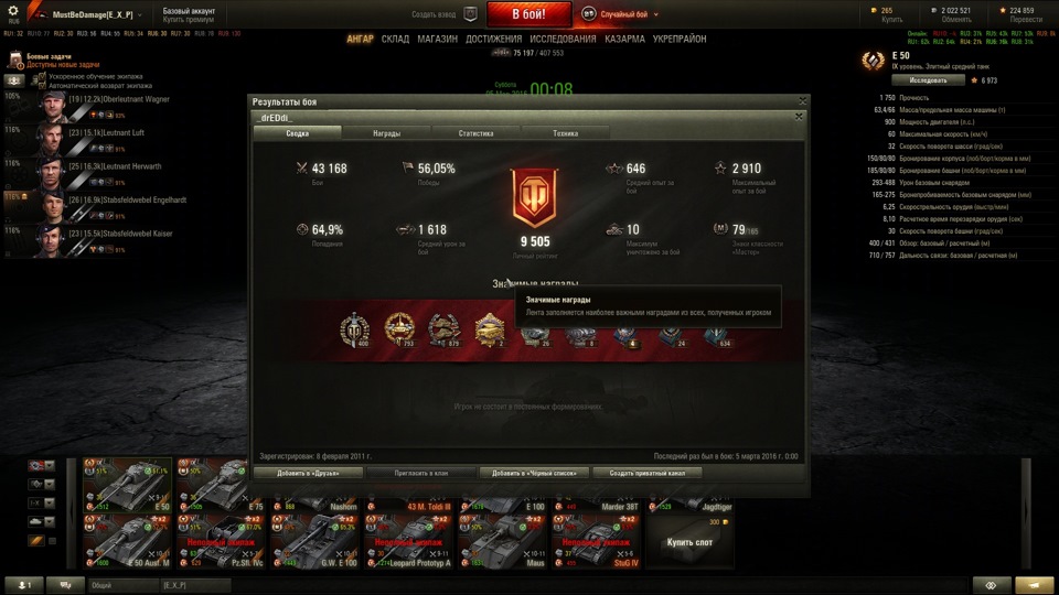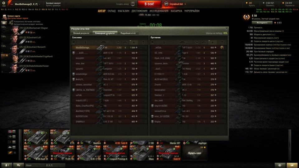 Последние 2.5к боев катаюсь исключительно на Е-50, а вкурил я его после Е-50М и Леопарда, испытав все *прелести* топ 10. (Е-50 был проходной), а теперь самое интересное-хз знает как но!, при 46к!боев, я поднял статистику Е-50 с 47% до 51.5% побед (кто понимает о чем я-прикиньте=)), а общая стата при игре на етом танке поднялась на 0,4%. Самая точная пушка в игре, экипаж по 4 (правильных) перка весь на 100%, чтобы там не говарили об плохой маскировке е-50-камуфляж, правильный выбор позици (архиважно), самое главное ДУМАТЬ в каждом бою быстро как на дороге при экстримальных ситуациях и урон в каждом бою по 2-2.5к вам обеспечен, своего старшего собрата Е-50М в ближнем бою как орех колет. Вот вам пару скринов для сравнения. На сегодняшний день ето мой самый любимый танк. При не пробити топ тт заряжаем голду, важен результат боя -ПОБЕДА!