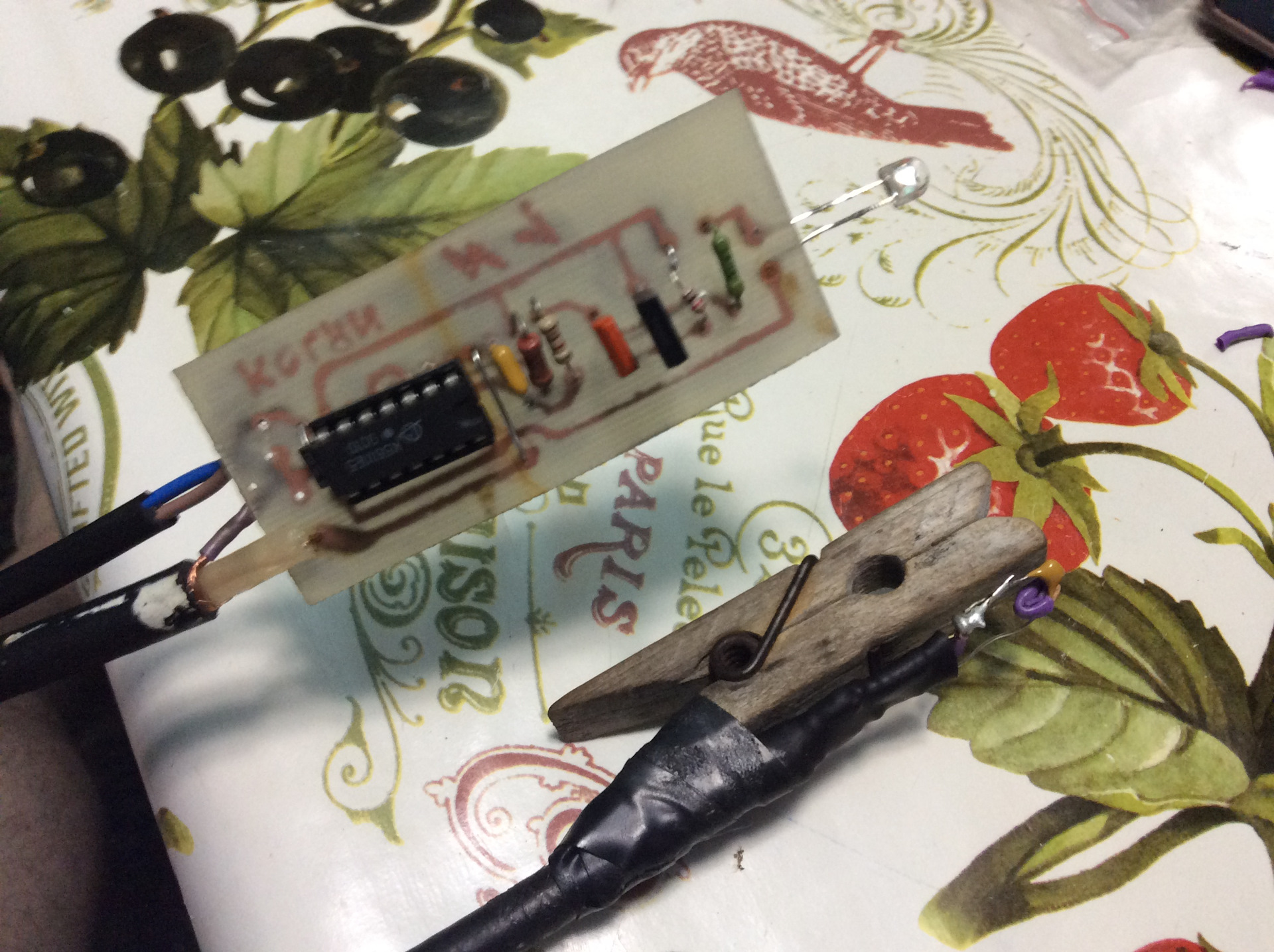 в первую очередь, на прищепке точно нужные элементы и точно распаяны? смотри качество сборки — сопли, канифоль на плате. провод можно не экранированный .