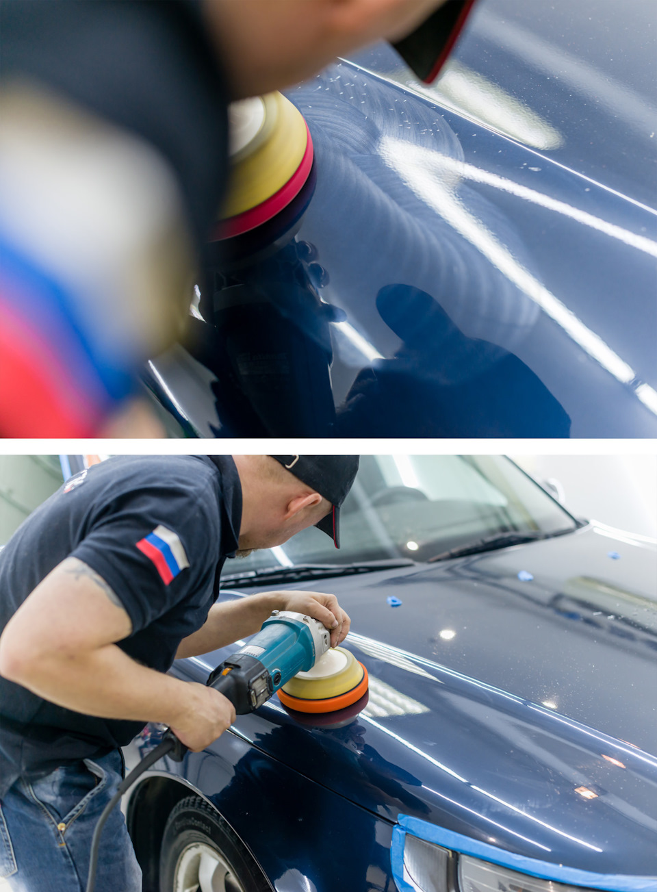 ✔ нанесение гидрофобных средств длительного действия («антидождь»);