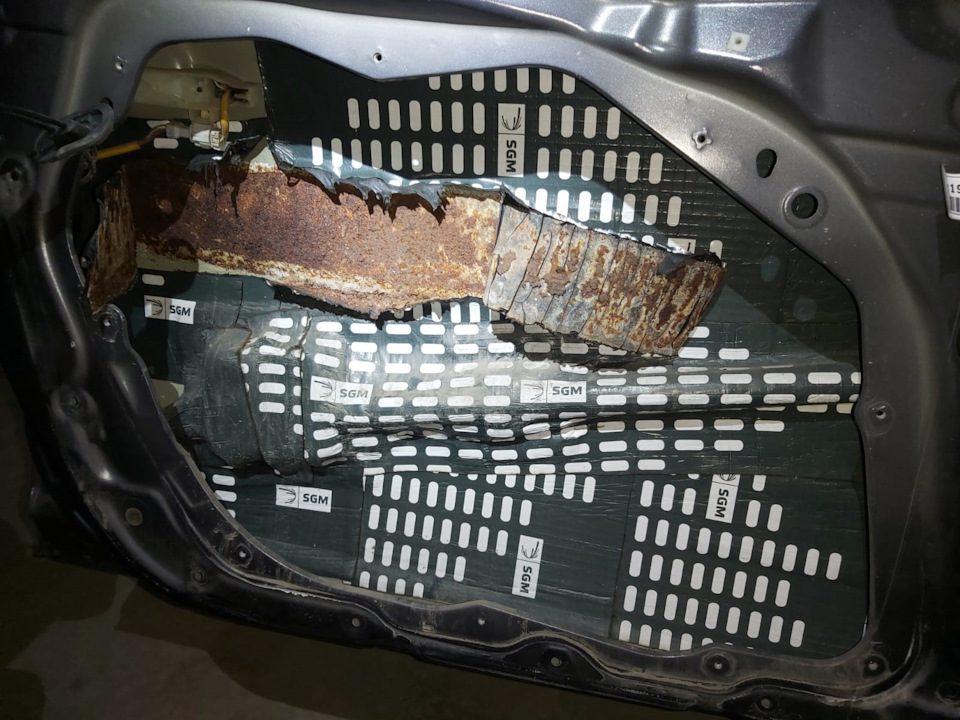 Исходя из фото возник первый вопрос — если главным условием было НЕ использование "битумных матов" — что же наклеено на дверях? На остальных фото понятно, что первый слой — Noxudol, второй — на днище видимо СПЛЭН (или скорее всего строительный Изолон), на арках рельефный (!) поролон, в багажнике судя по всему тоненький СмартФлекс (3 мм). В общем мы поняли, что если делать по-хорошему — нужно отрывать все это и клеить заново. Вопрос был в адгезии Noxudol к металлу и штатной виброизоляции. ПОэтому оставалось только дождаться приезда машинки к нам…
