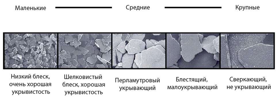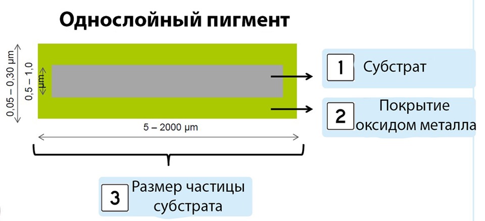 В процессе производства пигмента есть 3 ключевых параметра, которые можно варьировать: субстрат (материал подложки), различные варианты покрытия оксидом металла, и размер частицы субстрата.