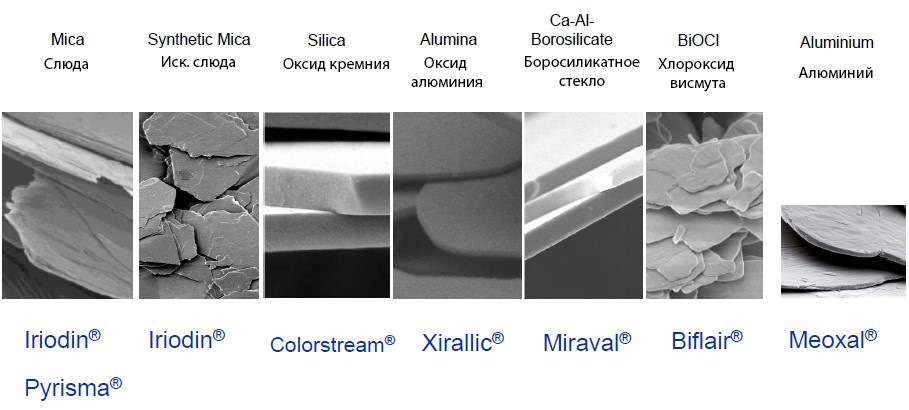 1. Натуральная слюда / искуственная слюда. Производится в Германии, Японии и США. Для пигментов на основе слюды характерна высокая укрывающая способность. Применяется в сериях Iriodin ® (PCIxxx) и Pyrisma® (PCPxxx).
