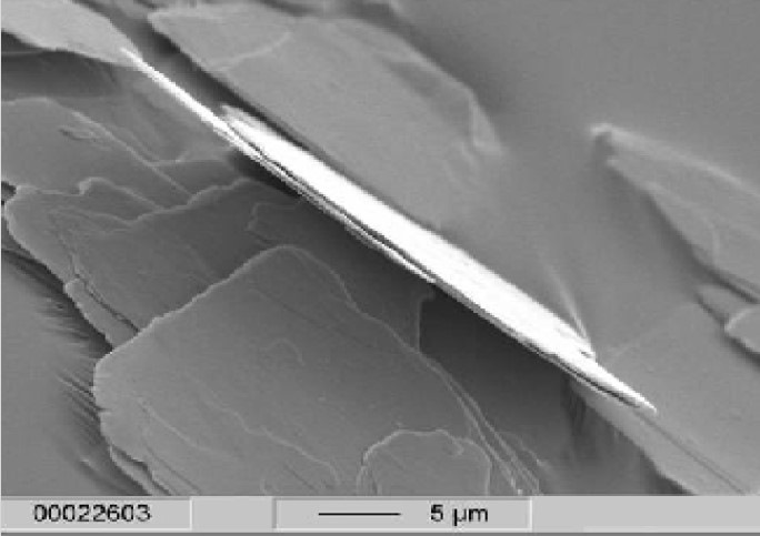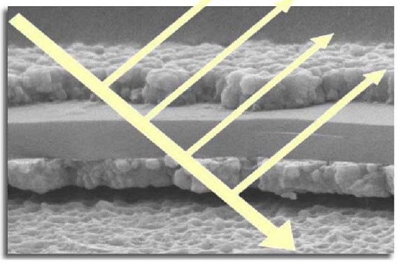 Под электронным микроскопом частица пигмента оксид металла — слюда — оксид металла выглядит так. Стрелочки показывают одновременно отражение, преломление и прохождение света через частицу пигмента, что и создает игру света