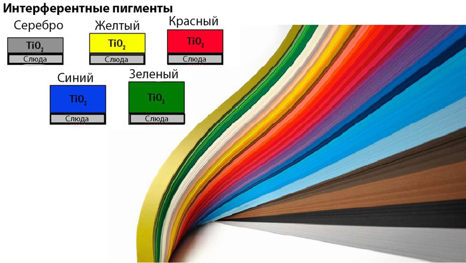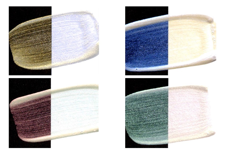Как уже говорилось, одна часть света отражается от поверхности пигмента. Отраженный свет варьирует цвет от серебристого, желтого, красного, синего и зеленого. Остальная часть света проходит через слой диоксида титана и привносит дополняющий цвет в отраженный. Наш глаз воспринимает отраженный свет, но что мы в действительности видим — это отраженный + дополняющий цвет, в зависимости от цвета фона под слоем пигмента.