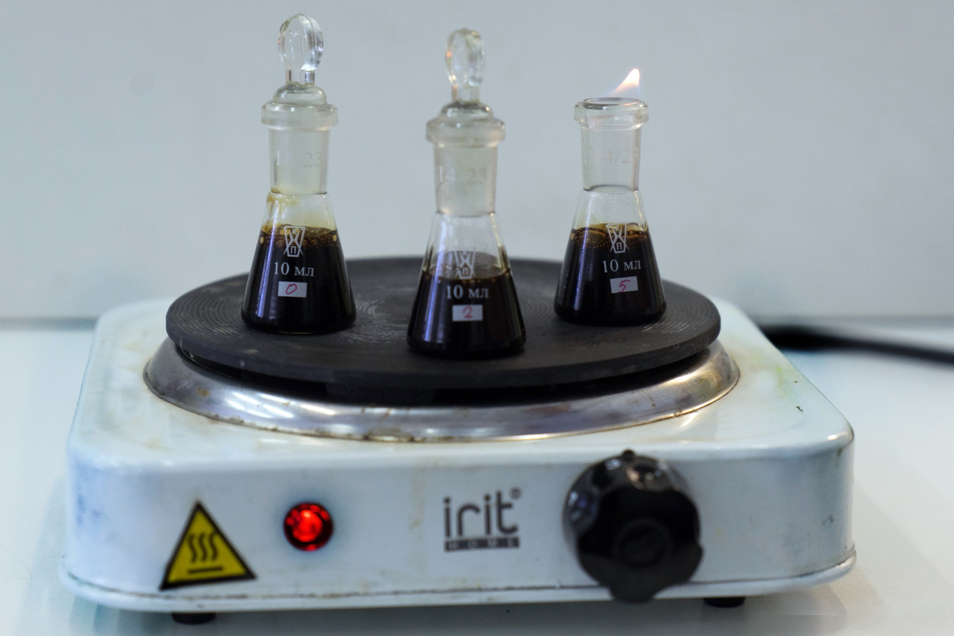 В своём опыте мы использовали обычные пробирки с отработанным маслом и плитку.