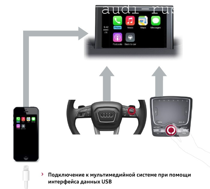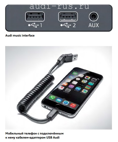 • используется Audi music interface для подключения смартфона к системам автомобиля с помощью кабеля USB.