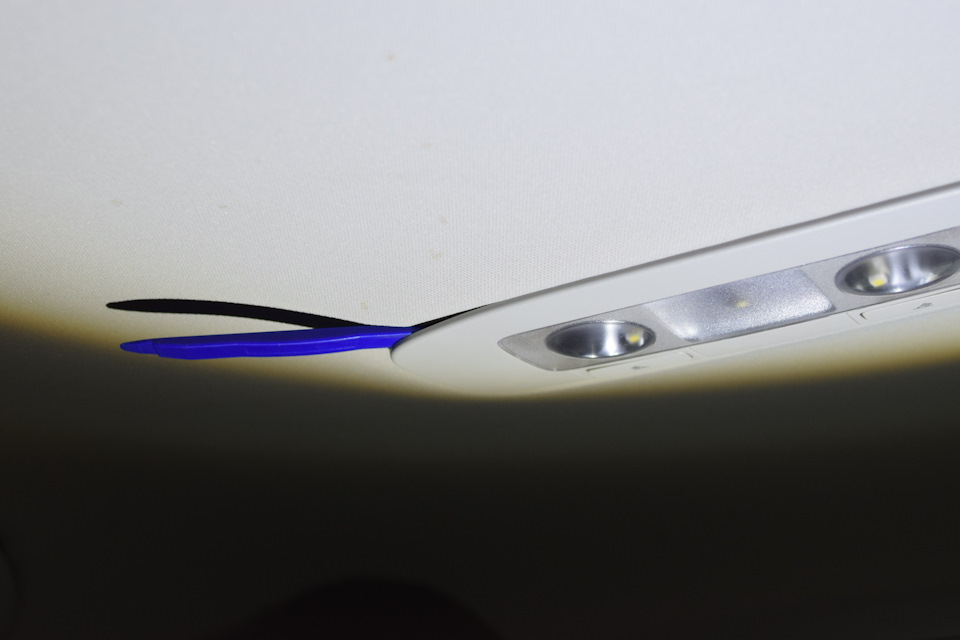 Если данного инструмента у вас нет, то мы рекомендуем использовать маленькую шлицевую отвертку, обернутую в текстиль, — это поможет сохранить внешний вид обшивки потолка и пластика плафонов в исходном виде.