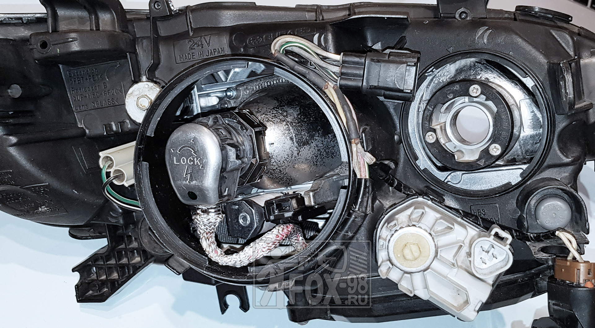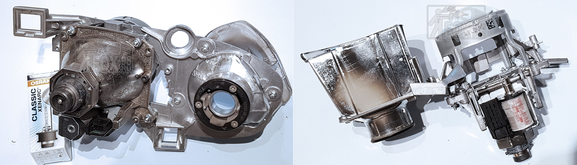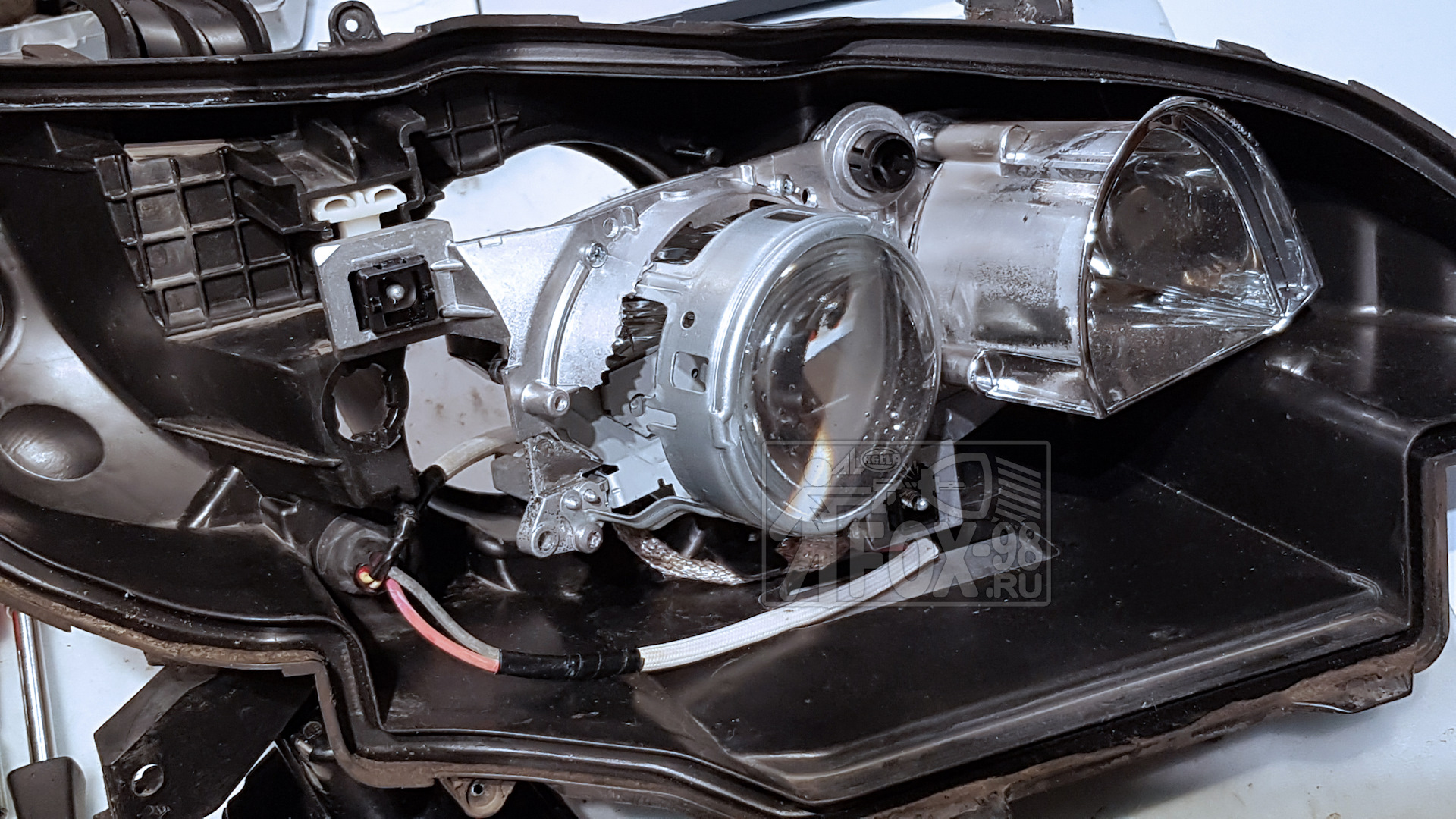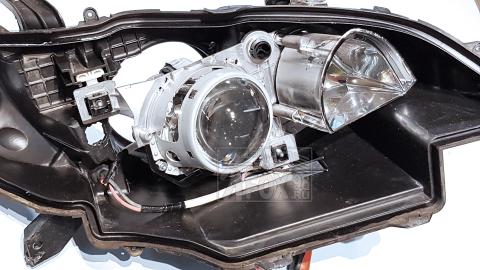 Чтобы добраться до линзовых модулей, фары необходимо вскрыть, то есть отделить так называемое стекло (плафон) от корпуса фары. Чтоб ничего не повредилось и не отломилось, желательно это делать после общего нагрева фары до температуры 80-90гр. Фары собраны на герметик по физическим свойствам схожий на детскую игрушку "лизун". Желательно сразу заменить этот герметик на новый