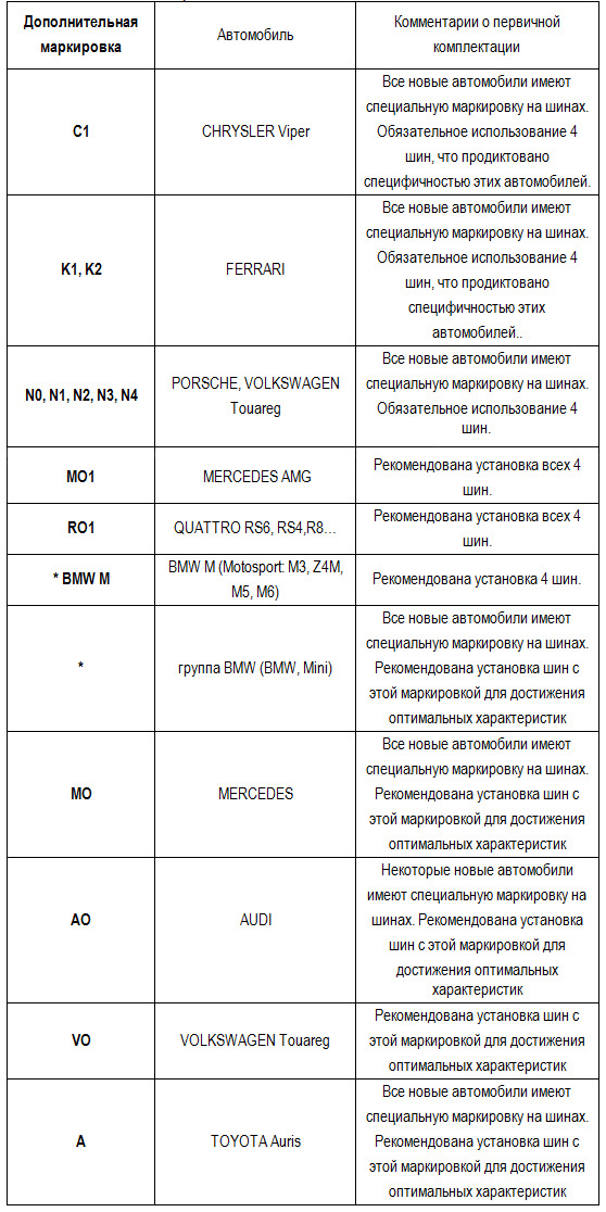 Внимание! Согласно рекомендациям Мишлен, омологированные шины для автомобилей Ferrari не рекомендуется устанавливать на другие автомобили. Шины с омологациями для спортивных версий автомобилей Mercedes (маркировка MO1) и автомобилей Porsche (маркировки N0, N1 и т.д.) могут устанавливаться на другие автомобили при условии установки всех четырех шин, а также при соответствии этих шин размерам, рекомендованным автопроизводителем.