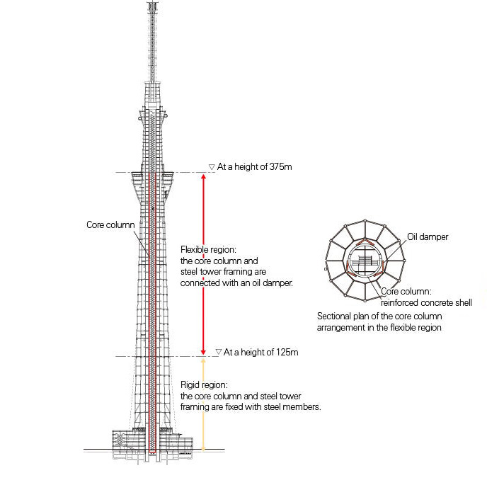 Землетрясение 2011 года не просто «тряхнула» острова – цунами разрушило атомную электростанцию в префектуре Фукусима. В результате подземных толчков и наводнения погибло свыше 15 000 человек. Но сейсмоустойчивая конструкция “Небесного дерева”, сочетающая инерционные и масляные демпферы производства KYB, не получила ни малейшего повреждения.