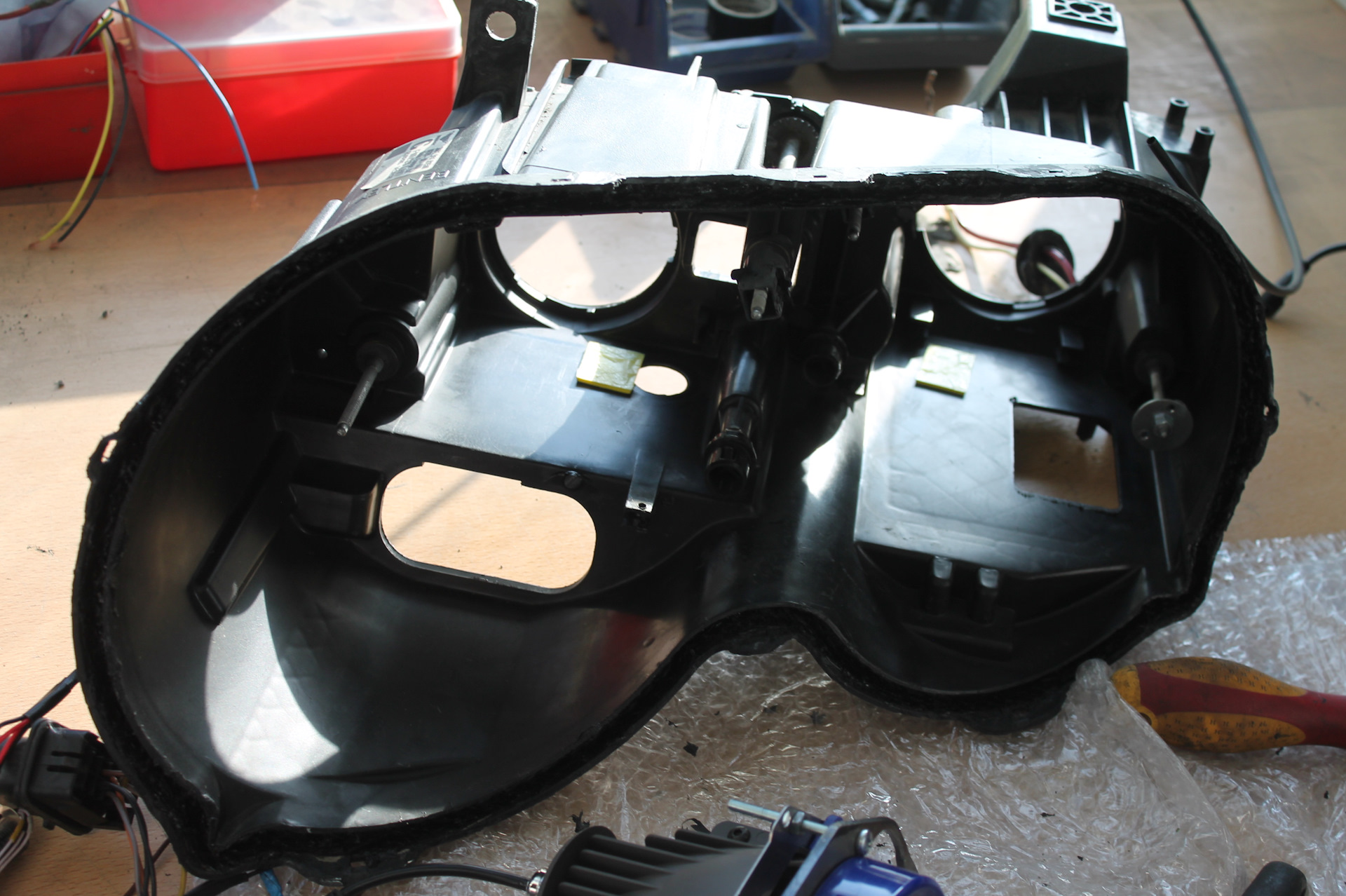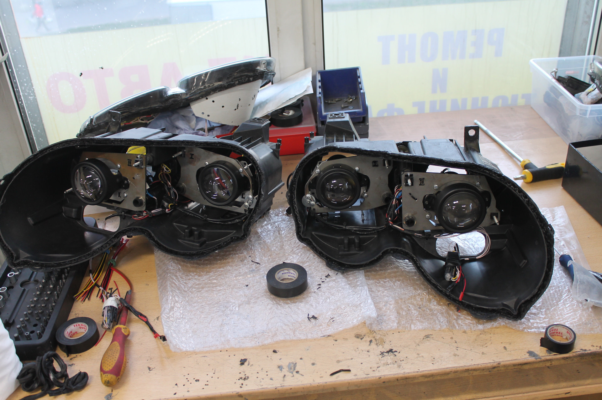 Было принято решение -снести всю установку, то что натворили чудо ретрофитчики, кроме светодиодных элементов. Эту часть мы доработали по уму поставив разъёмы -иначе стекло фары не разъединялось с корпусом во время установки.