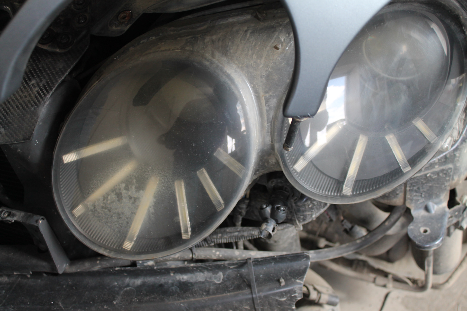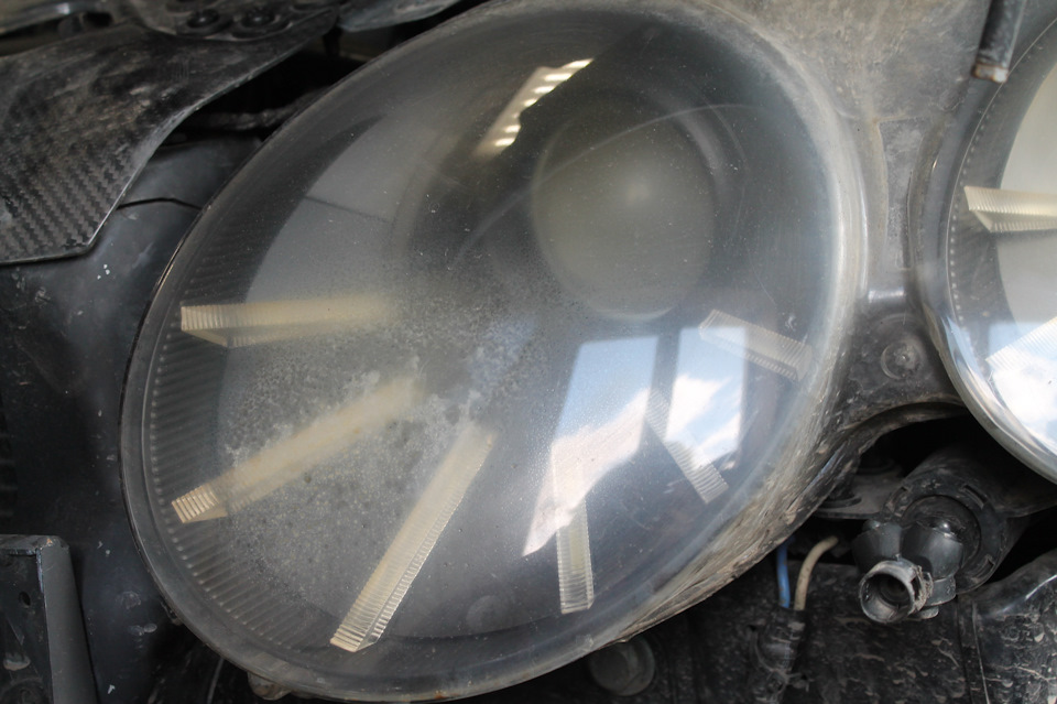 Именно в результате этого происшествия налёт образовался на всей внутренней поверхности фары включая стекло изнутри, переходную рамку и весь линзованный элемент который был установлен вместо дальнего света.