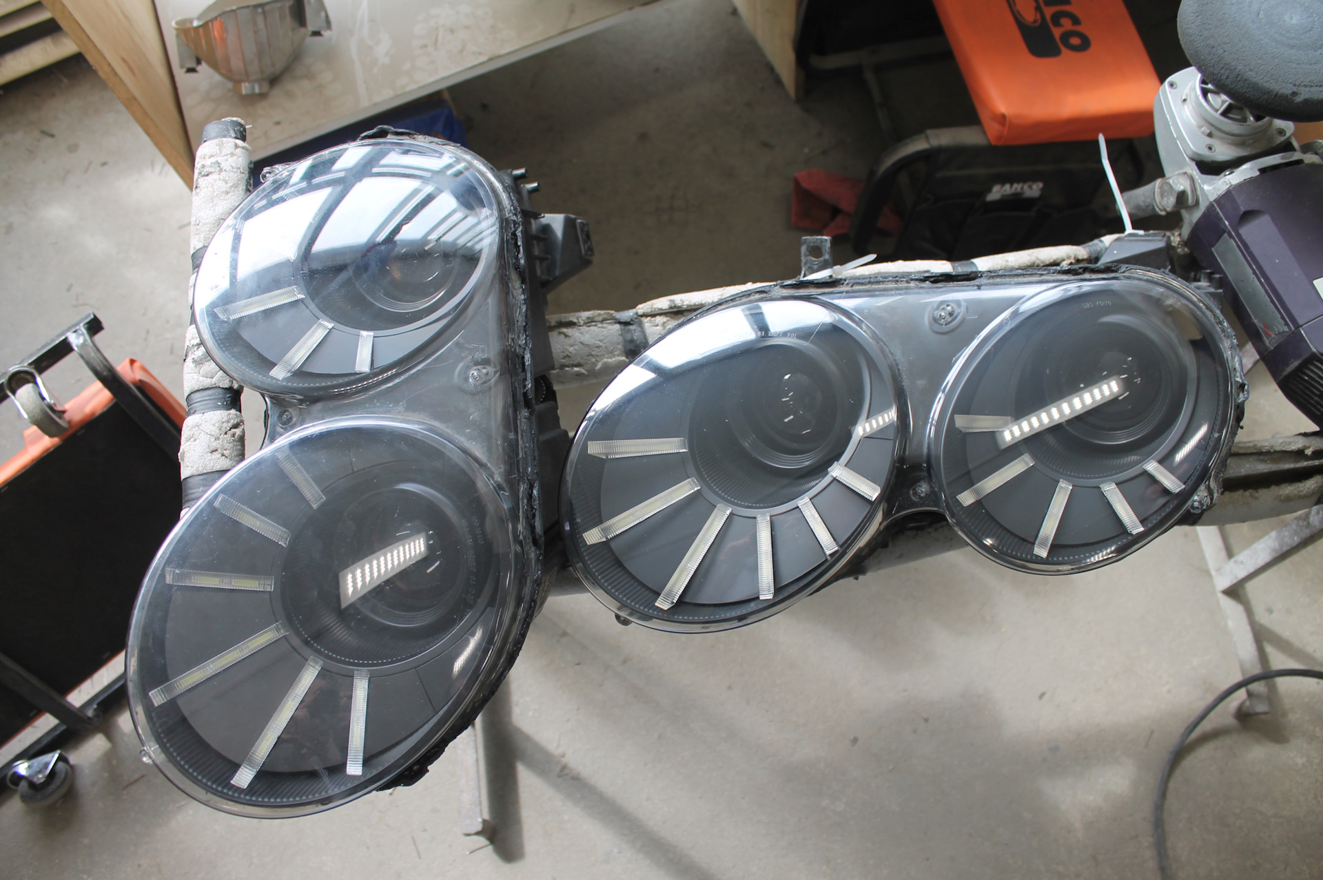 Идея как и говорил была хороша-сделать 4 би ксеноновые линзы. А так же оригинальные светодиодные ДХО + ГАБАРИТЫ + ПОВОРОТНИКИ. Скажу честно — за идею с LED и воплощение в проект-поставил бы наверно даже 4 с минусом по 5 бальной шкале. Повторюсь-идеи хороши -но практическое воплощение иногда поражает. Об этом попозже.