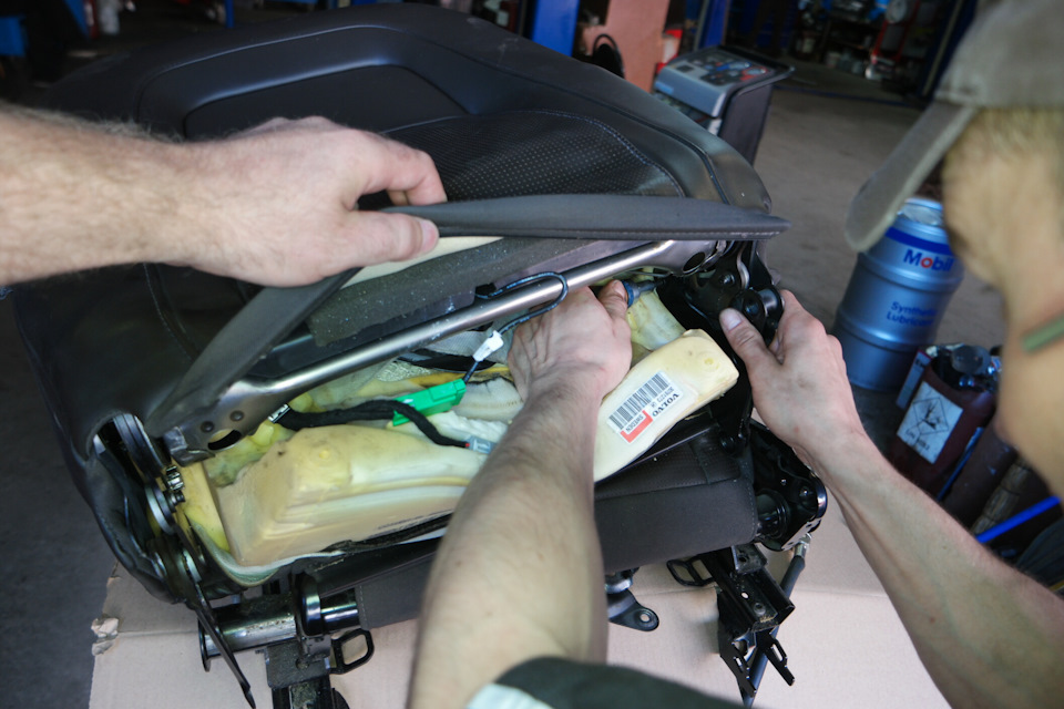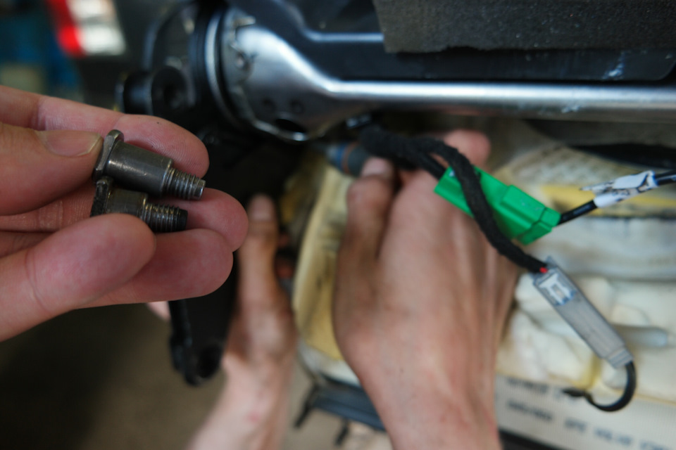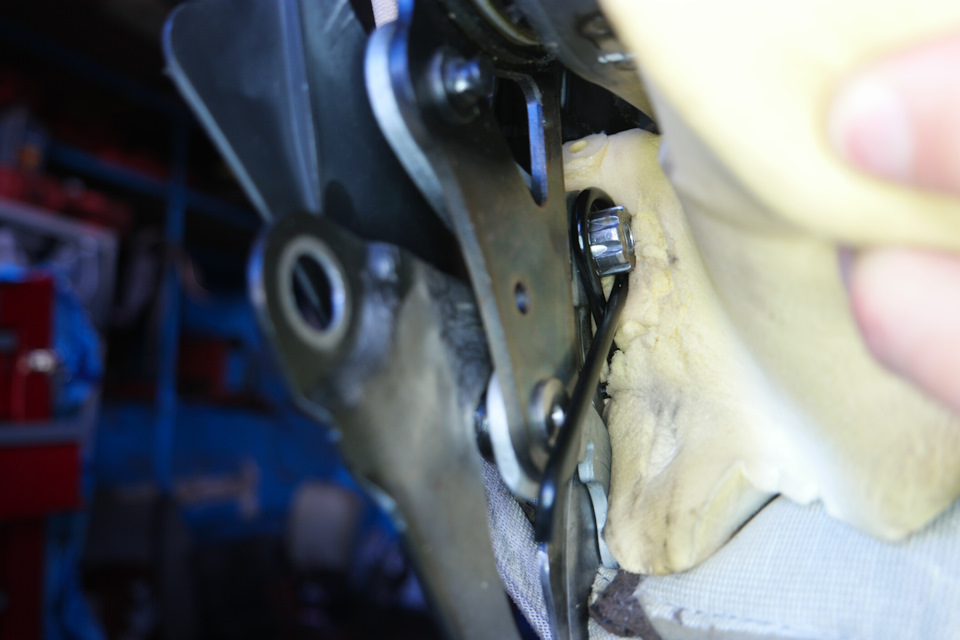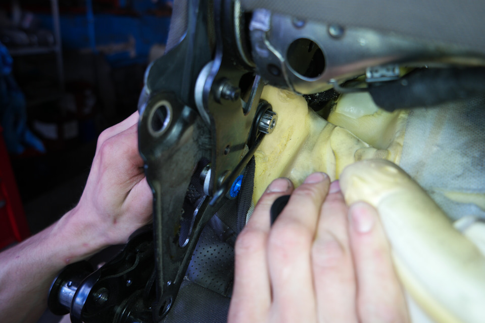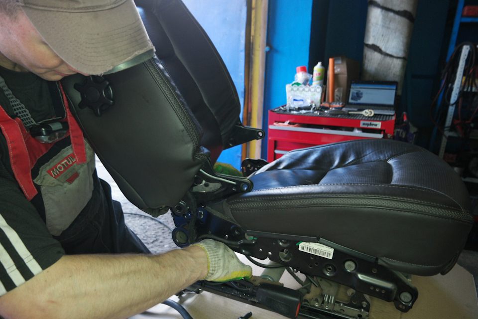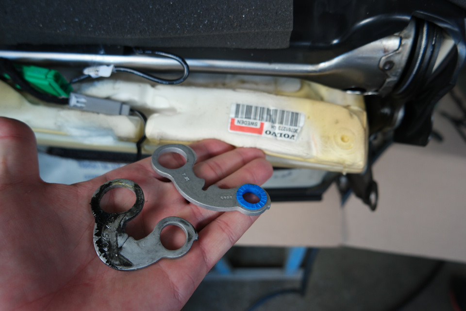 Монтаж новых элементов занял существенно больше времени, чем демонтаж. К тому же новый болт из набора оказался длиннее, отчего пришлось использовать старый. В остальном всё совпало. Кресло работает, щель отсутствует, пассивная безопасность восстановлена!