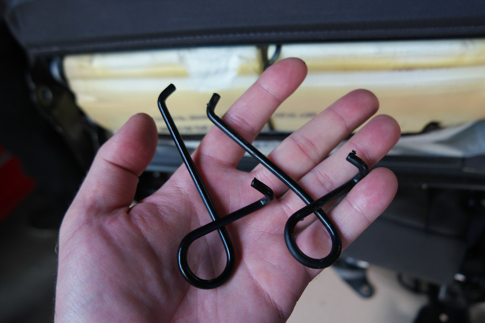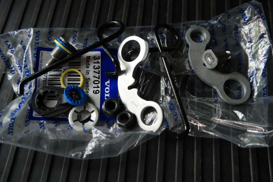 Для ремонта существует оригинальный комплект за номером 31377019. В него входят те самые скобы, пружины, пластиковые втулки, шайбы и крепёжные элементы. Нужно всего лишь на снятом кресле демонтировать отработанные элементы и поставить новые.