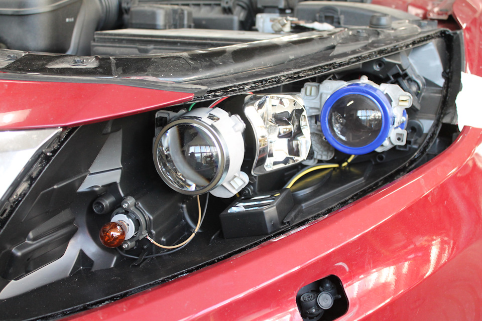 Дальше стандартно разбираем фары в печке и методом сильных механических преобразований и доработок ставим BI-LED модуль в секцию ближнего света