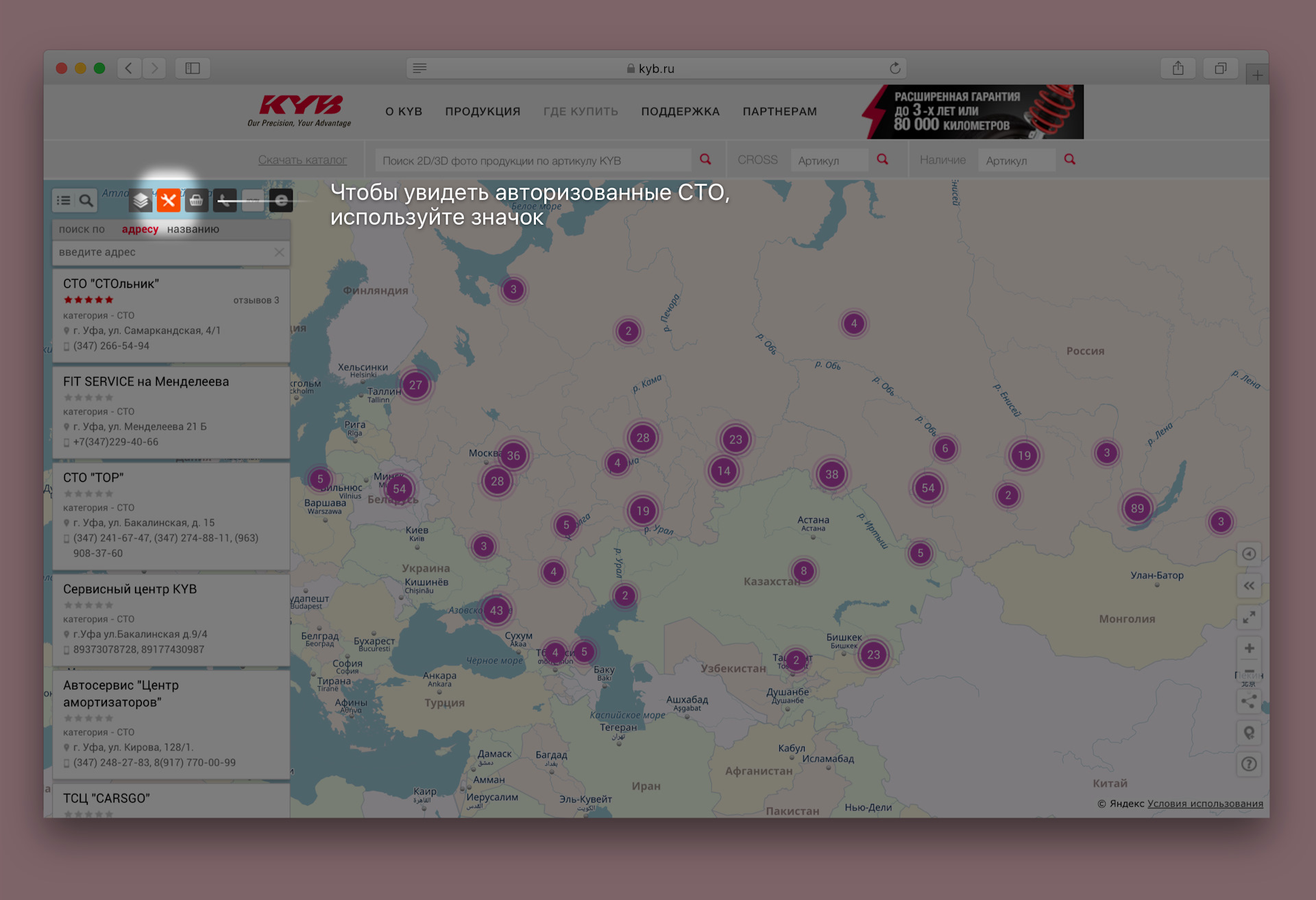Список всех авторизованных сервисных центров на kyb.ru/map