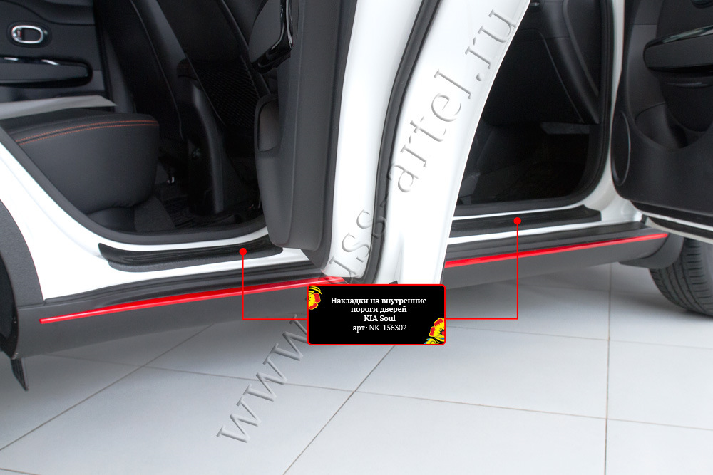 3. Так же нами были разработаны накладки на внутренние пороги дверей/ Изделие подходит на автомобиль Soul с 2014 г.в. Накладки на пороги надежно защищают лакокрасочное покрытие от царапин и сколов, в так же помогут скрыть уже существующие повреждения.