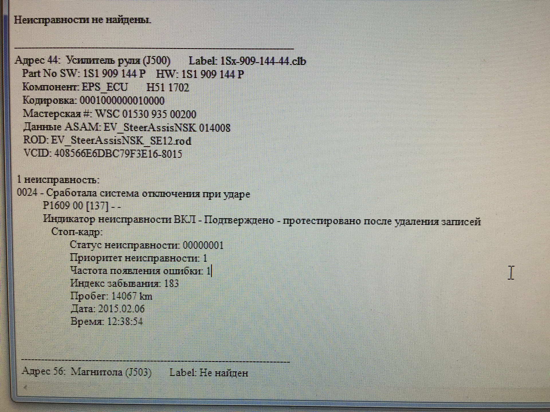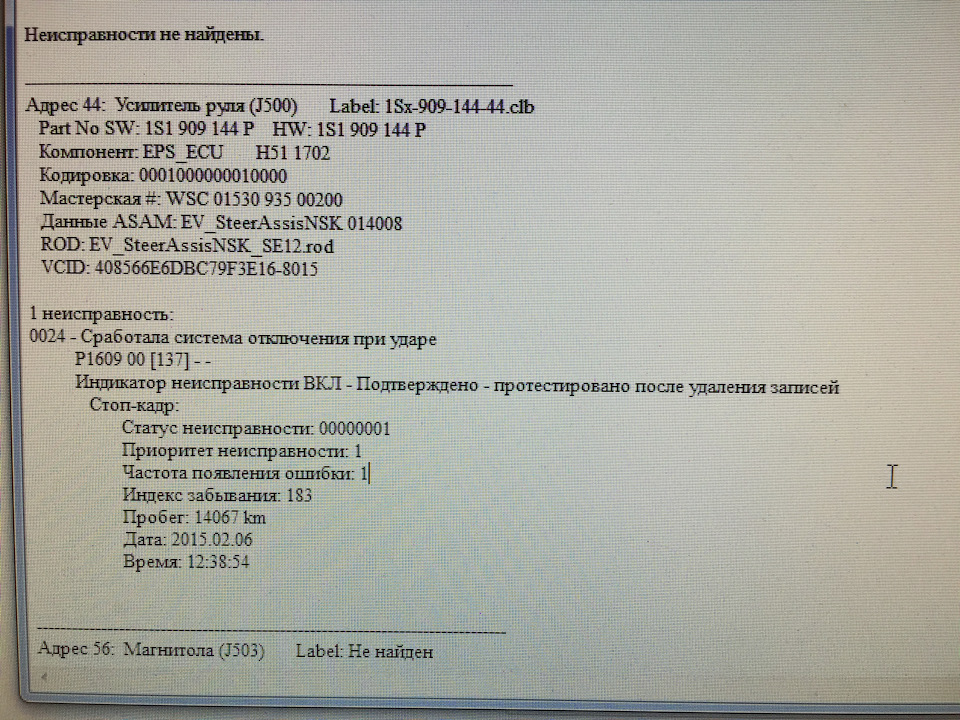 VW Polo / Skoda Rapid. Ошибка P1609 / P160900 — сработала система отключения при ударе. Удаляем краш. Восстанавливаем работу ЭУР.