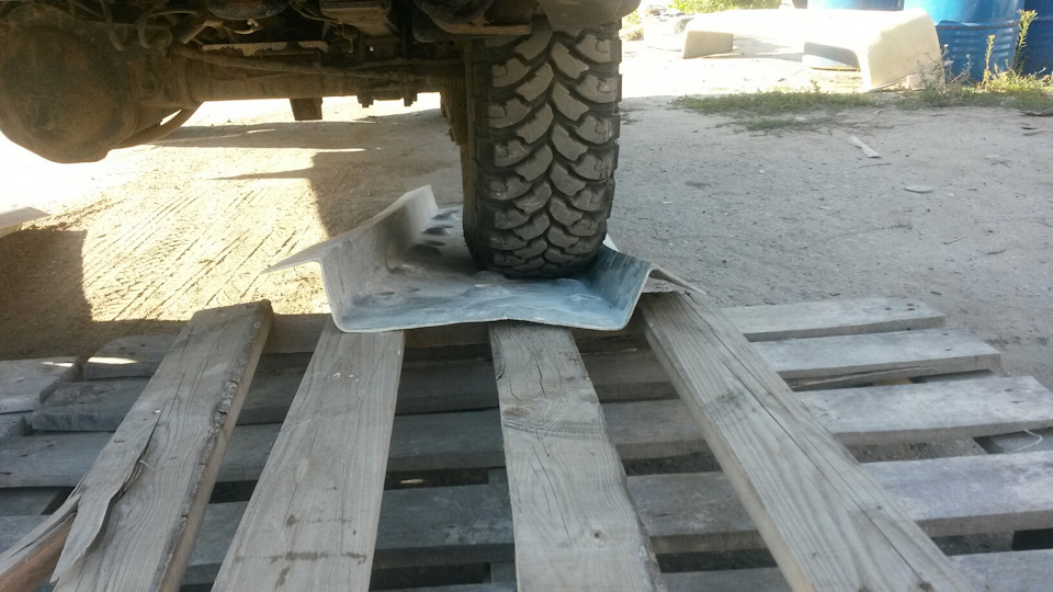 Типичная ситуация: машина правой стороной съехала в колею, поднимать надо за за бампера с правой стороны. Самое логичное, это положить поперек колеи сантрак или доску и поднять вначале правый зад, затем положить под колесо сантрак или доску. Только металические сантраки гнутся, даже от лёгкого эскудика