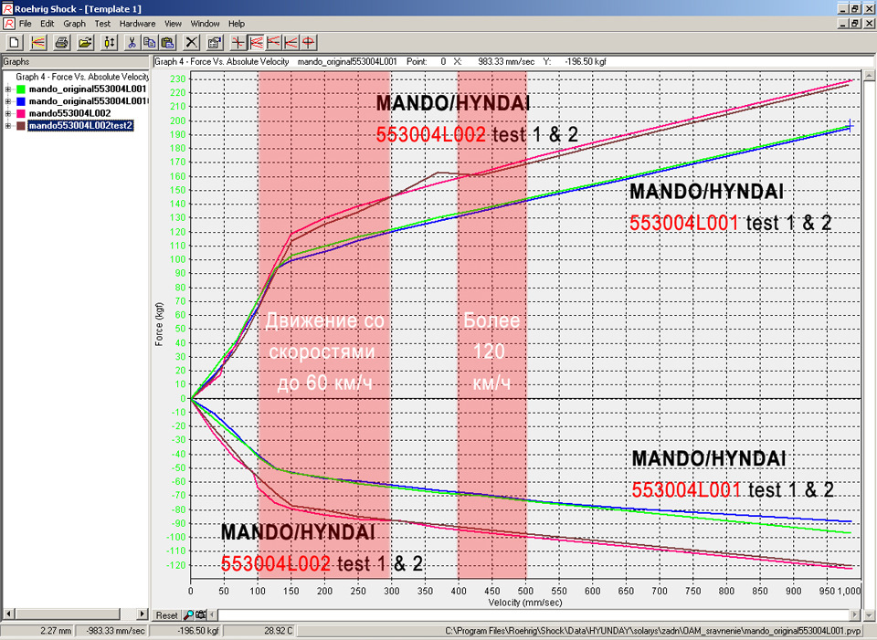Значение скорости движения штока 300мм/сек соответствует работе амортизатора при движении автомобиля в городском режиме. 400-500мм/сек соответствует движению со скоростями 120 км/ч и выше по неидеальному покрытию, то есть описаны условия, при которых «пасовала» подвеска первых HYUNDAI SOLARIS, выпущенных до 15 августа 2011 года. Значения скорости движения штока свыше 500мм/сек соответствуют экстремальным режимам эксплуатации – попадание колеса в яму.