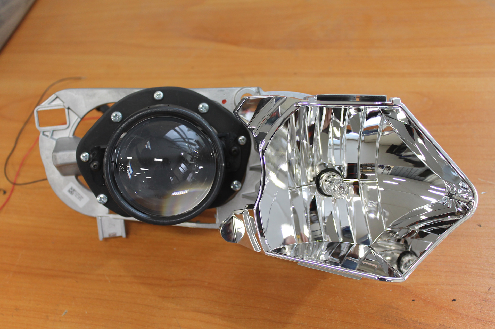 Дальше примерив светодиодные линзы BI LED I.LENS мы изготавливаем переходные рамки вручную и ставим вместо штатных галогеновых элементов светодиодные.