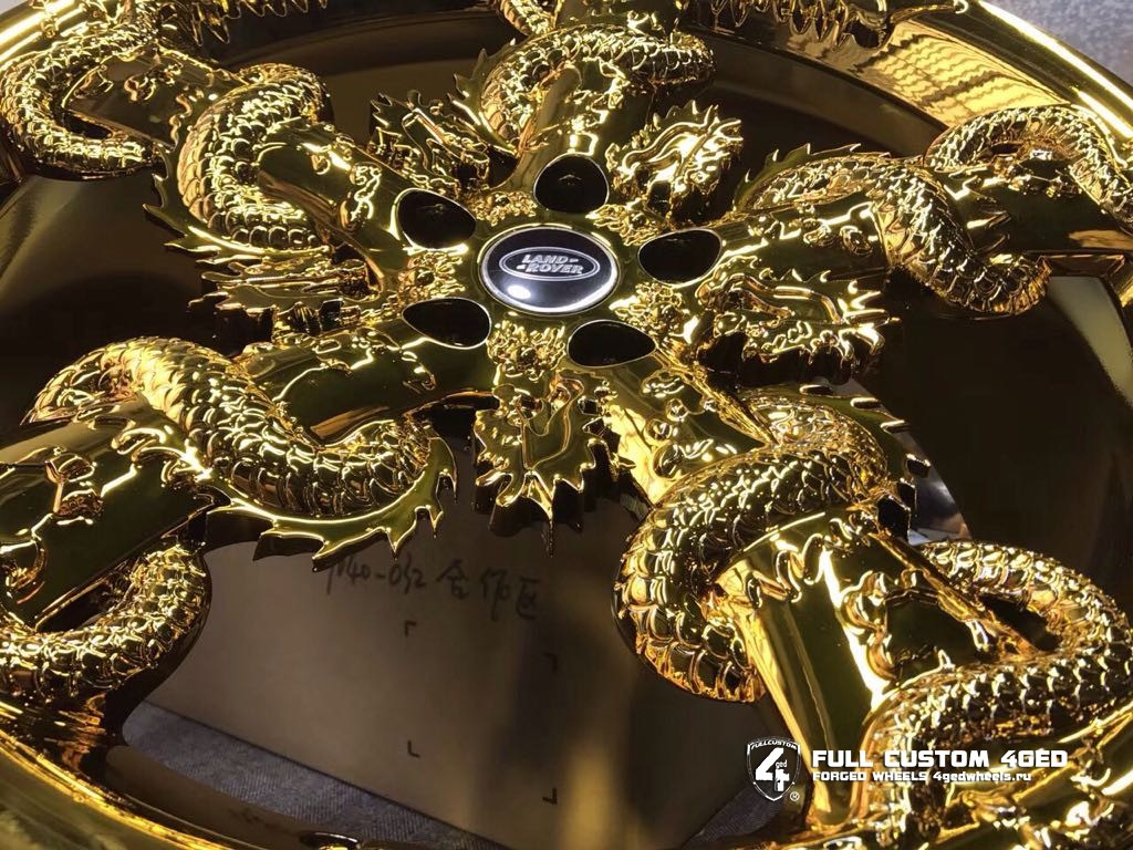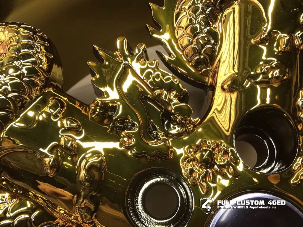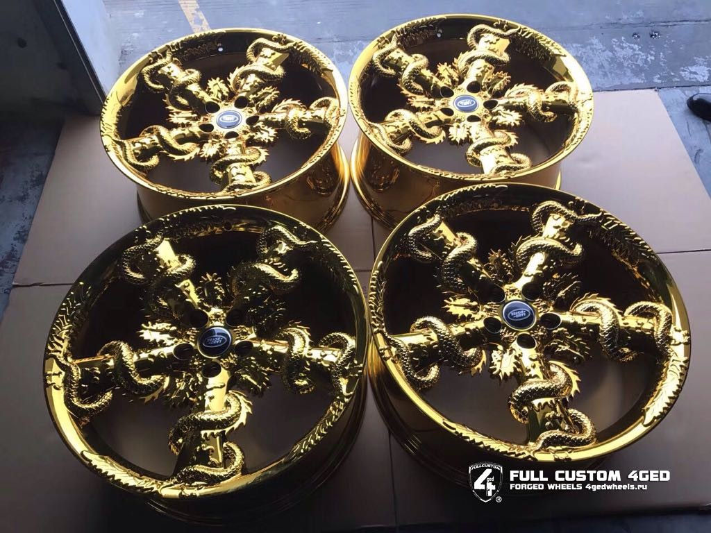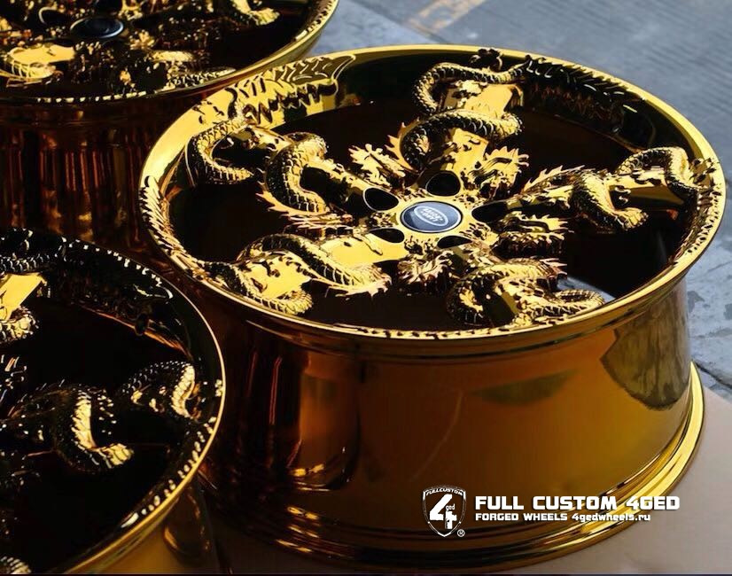 Друзья, представляем кастомные кованые моноблоки FULL CUSTOM 4GED в дизайне FC334. Выполнены для клиента из Азии на Range Rover в типично азиатском стиле — драконы на лучах в тщательной проработкой мелких деталей дизайна. и все это великолепие так удачно залито золотым хромом)) для русского человека картина неоднозначная, надо сказать, но тем не менее, демонстрируем уровень производственных возможностей))